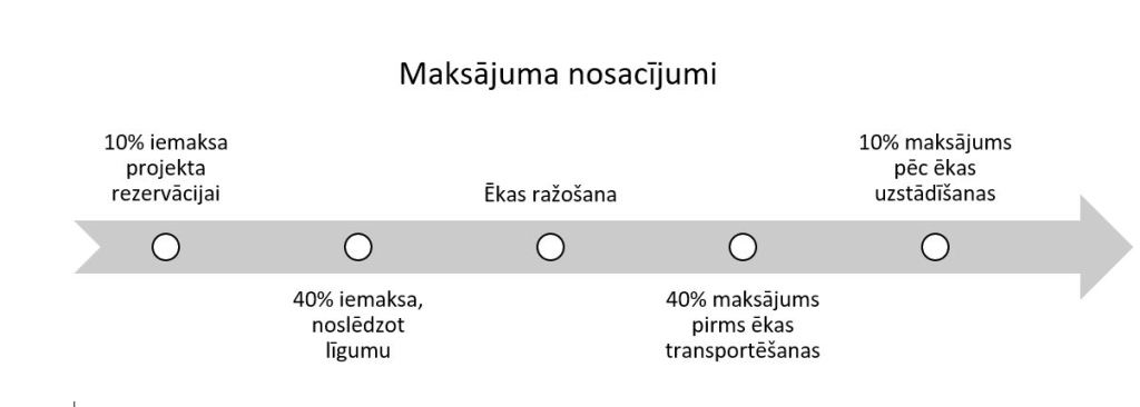 Cenā nav iekļauta projektēšana, pamatu izbūve, iekštelpu apdare, gaismas ķermeņi, apkures sistēma, piegāde un uzstādīšana.