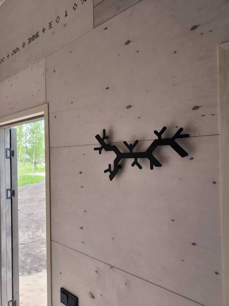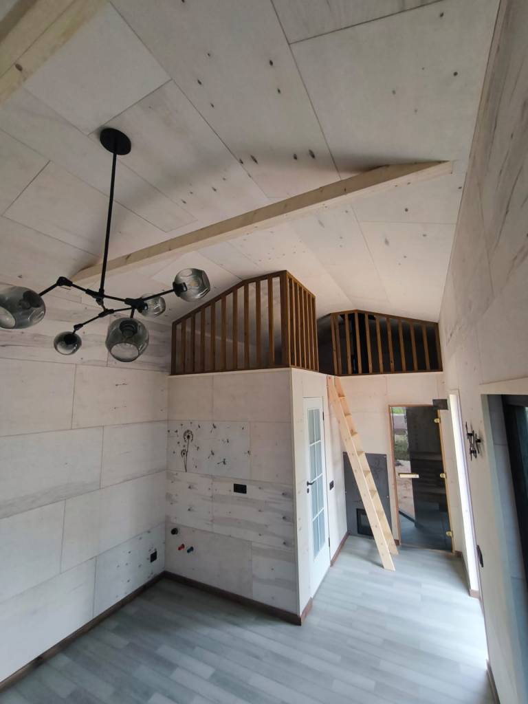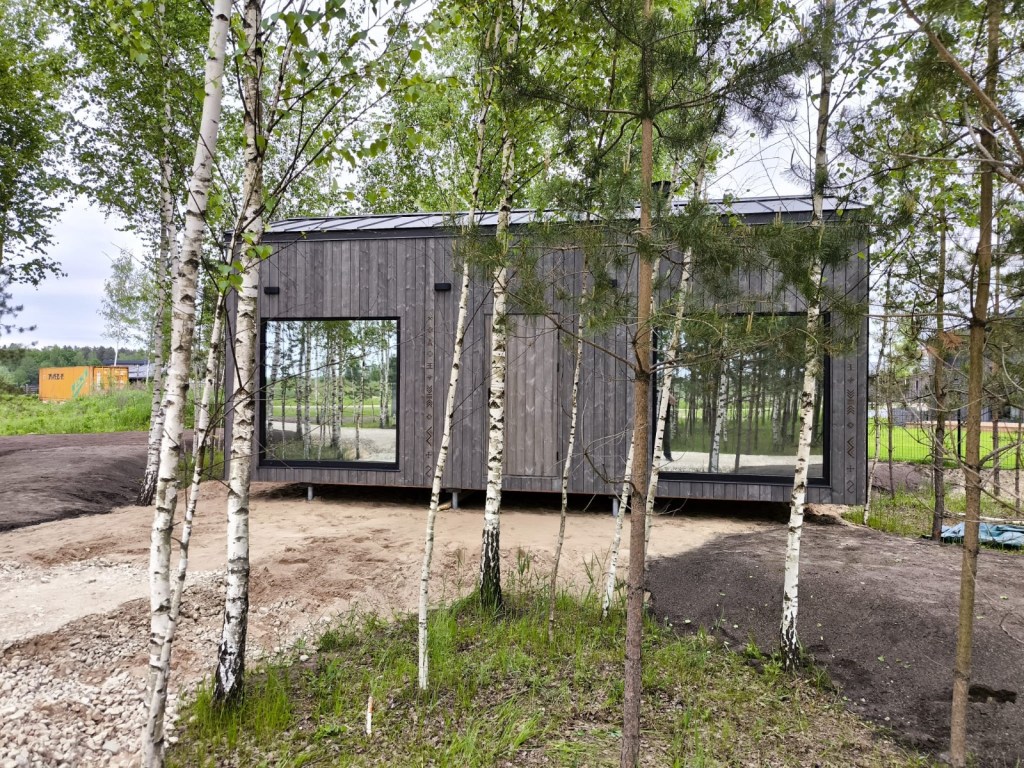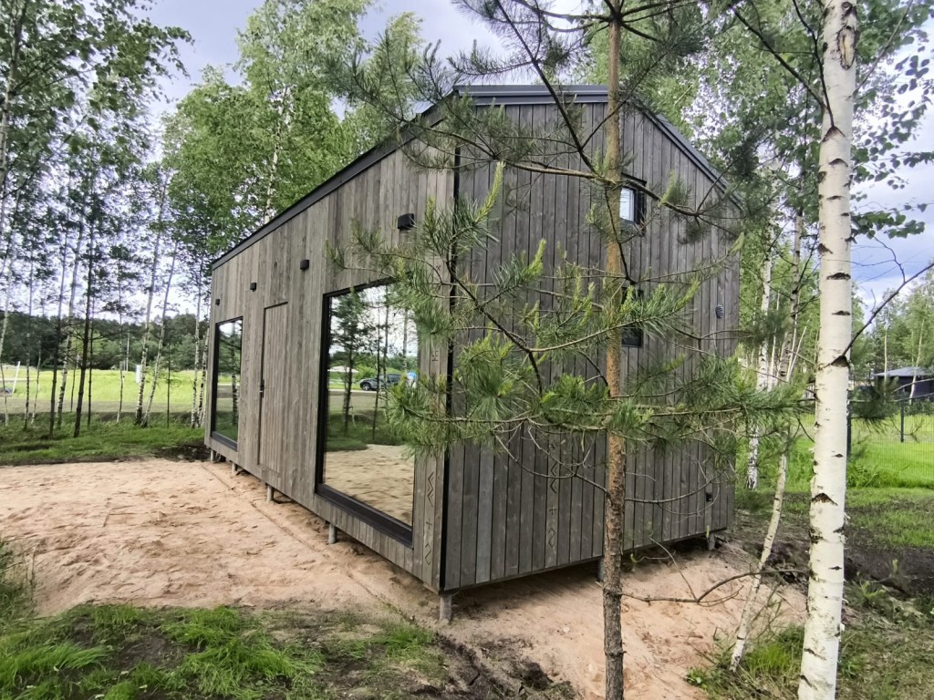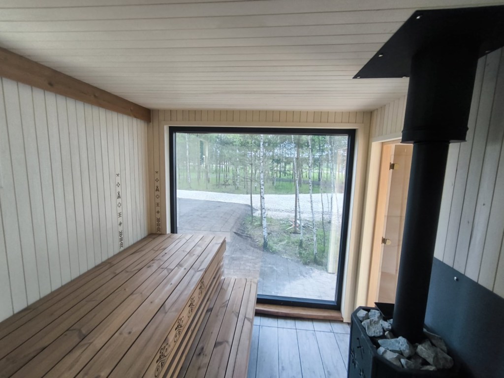 Neliela, askētiska pirts, kas izgatavota no 45x95mm bieza kalibrēta kokmateriāla un 100mm minerālvates. Augstas kvalitātes grafīta apdare, smalki zāģēti apdares dēļi ārējā apdarē. Follija siltuma atstarojoša izolācija pirts telpā. Pirts telpā lapu koka apdare tonēta balta, un trermokoka lāvas, akmens masas flīžu grīdas segums, kritums uz trapu. Atpūtas telpā bērza saplākšņa apdare tonēta balta, grīdā – vinila segums. Lieli vitrīnas logi ar tonējošu 95% spoguļplēvi. Metāla jumta segums ar poliuretāna pārklājumu. Dušas telpā akmens masas flīžu grīdas segums, telpa aprīkota ar dušu un attālināti vadāmu boileri ar pretaizsalšanas funkciju. Ūdens sistēmas caurules aprīkotas ar sildošo vadu, pasargājot no ūdens cauruļu sasalšanas. Malkas pirts krāsns, ražota Latvijā pēc TANTUM pasūtījuma. Nerūsējoša tērauda skurstenis. Divpunktu dabīgā ventilācija. LED gaismas lampas ar dizaina elementiem. Papildus izbūvēta lofta 10m2.