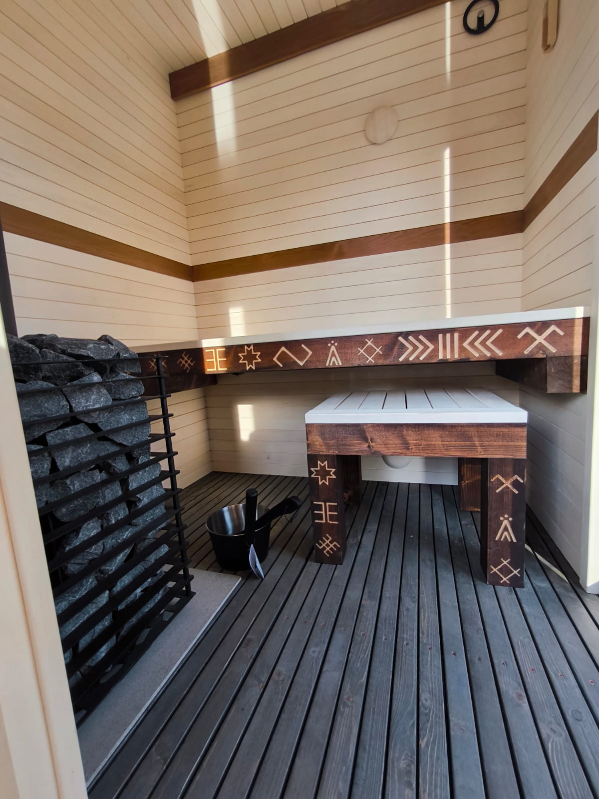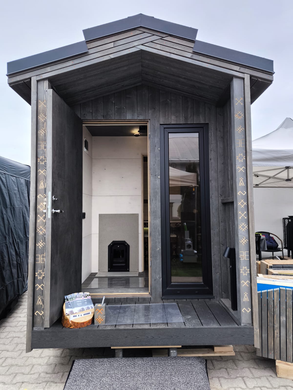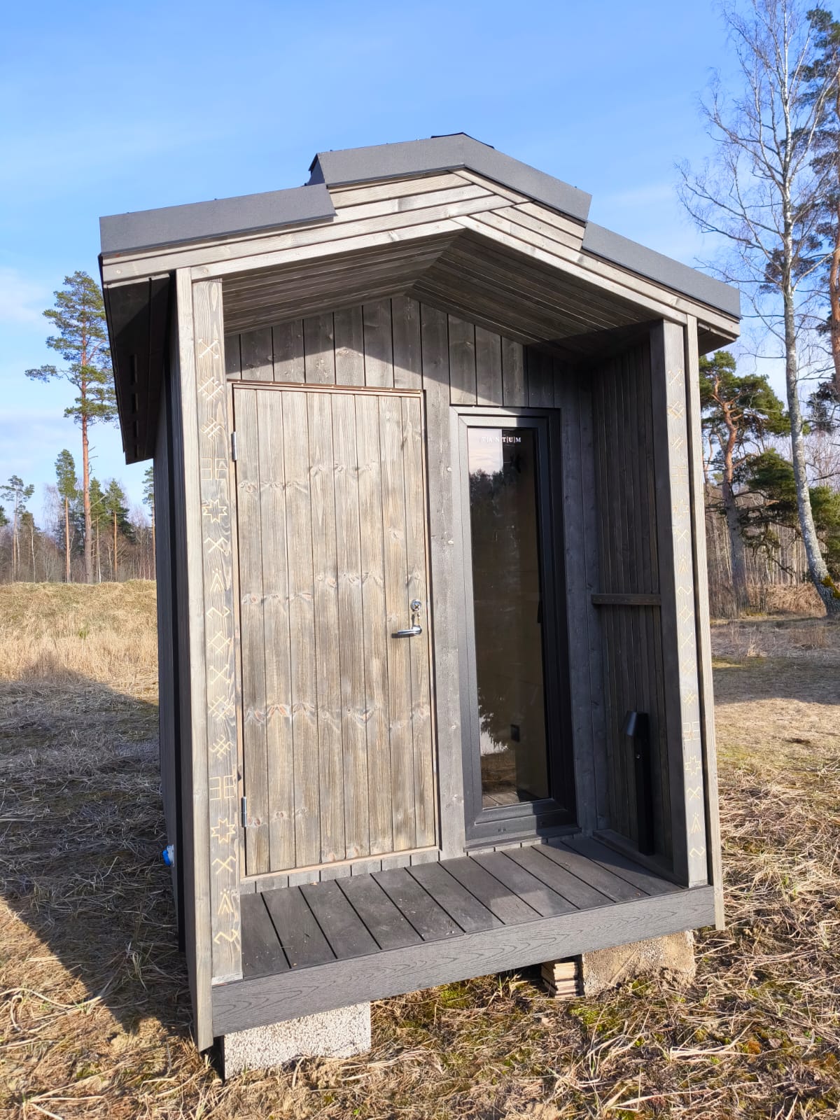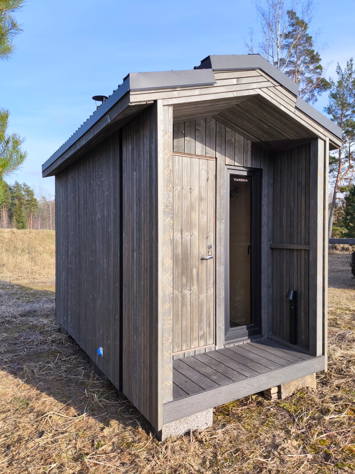 Neliela, askētiska pirts, kas izgatavota no 50x100mm bieza kokmateriāla un 100mm minerālvates. Ideāla novietošanai dārzā vai blakus terasei. Augstas kvalitātes grafīta apdare, smalki zāģēti apdares dēļi ārējā apdarē. Follija siltuma atstarojoša izolācija pirts telpā. Dubultā hidroizolācija pirts grīdā, kritums uz trapu. Liepas koka apdare pirts telpā – tonēta balta. Vienots grīdas segums no 45×45 mm kalibrēta kokmateriāla. LED apgaismojums, tai skaitā, dekoratīvs apgaismojums termokoka dēļos. Neliels logs pirts telpā un priekštelpā. Metāla profilēts jumta segums, antracīta krāsā. Slēdzamas durvis. Ar malku kurināma pirts krāsns.