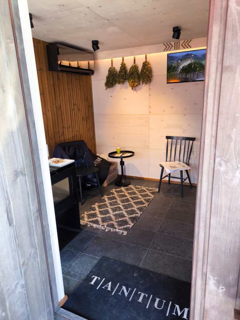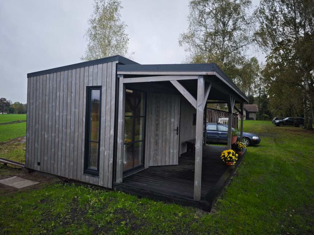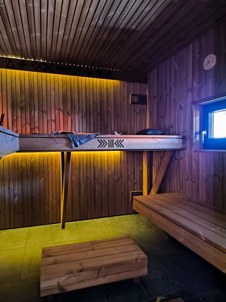 Neliela, askētiska pirts, kas izgatavota no 45x95mm bieza kalibrēta kokmateriāla un 100mm minerālvates. Pirts gatavota pēc pirtnieces pasūtījuma ar augsto lāvu pēršanai. Augstas kvalitātes grafīta apdare, smalki zāģēti apdares dēļi ārējā apdarē. Follija siltuma atstarojoša izolācija pirts telpā. Pirts telpā termokoka apdare un lāvas, akmens masas flīžu grīdas segums, kritums uz trapu. Atpūtas telpā bērza saplākšņa apdare tonēta balta. Lieli vitrīnas logi ar tonējošu 95% spoguļplēvi. Metāla jumta segums ar poliuretāna pārklājumu. Tualetes telpa aprīkota ar attālināti vadāmu boileri ar pretaizsalšanas funkciju. Ūdens sistēmas caurules aprīkotas ar sildošo vadu, pasargājot no ūdens cauruļu sasalšanas. Malkas pirts krāsns, ražota Latvijā pēc TANTUM pasūtījuma. Nerūsējoša tērauda skurstenis. Divpunktu dabīgā ventilācija. LED gaismas lampas ar dizaina elementiem. Pirtiņā ierīkota silto grīdu apsilde (katrai telpai savs sensors) un gaiss-gaiss siltumsūknis, kas vadāmi atsevišķi attālināti caur wi-fi.