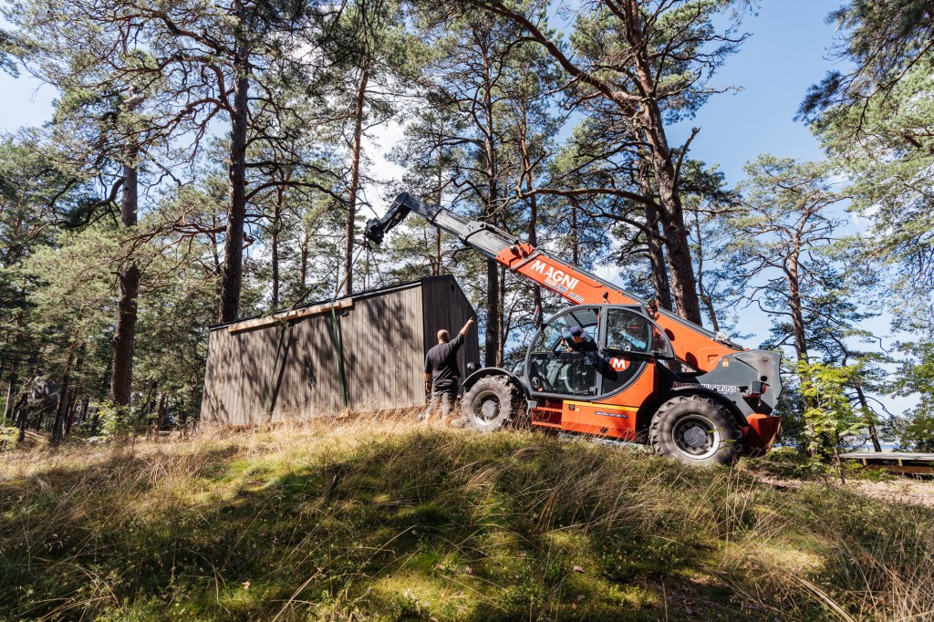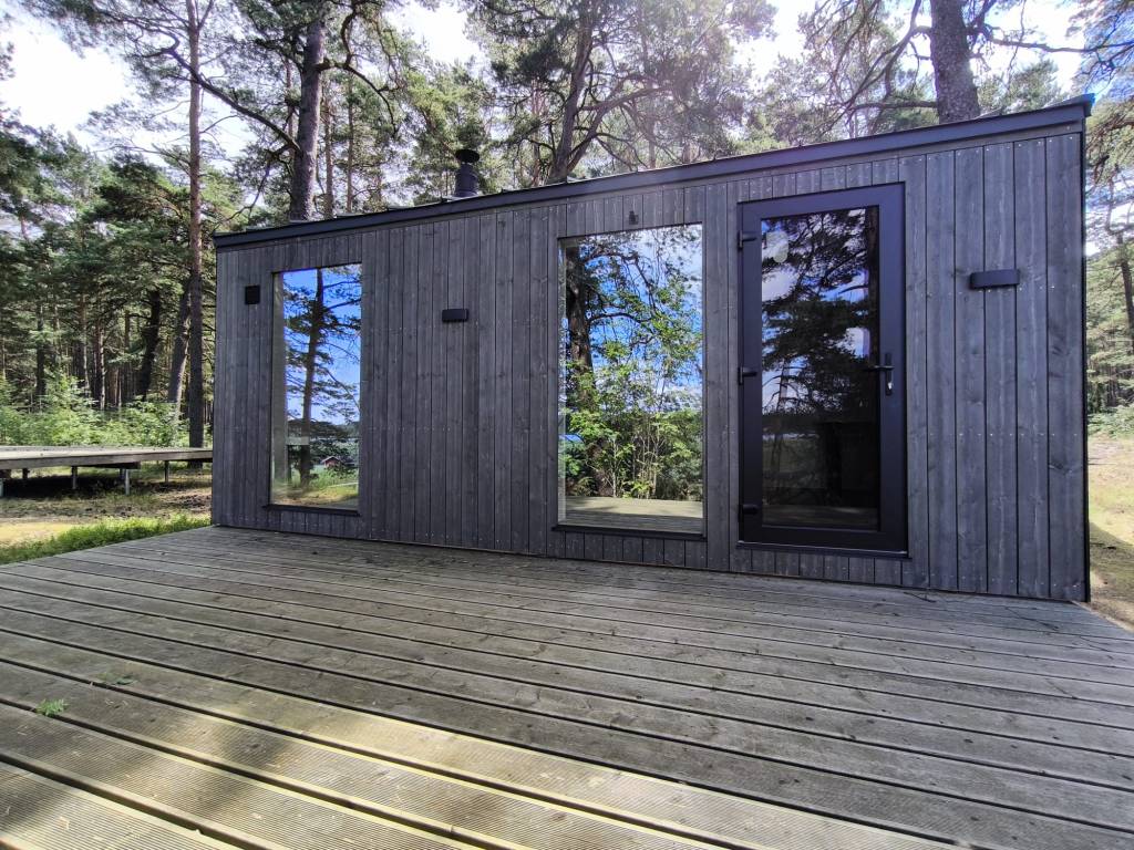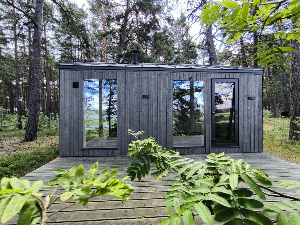 Neliela, askētiska pirts, kas izgatavota no 50x100mm bieza kokmateriāla un 100mm minerālvates. Augstas kvalitates grafīta apdare, smalki zāģēti apdares dēļi ārējā apdarē. Follija siltuma atstarojoša izolācija pirts telpā. Lapu koka apdare pirts telpā – tonēta balta. Pirts telpā flīžu grīdas segums, kritums uz trapu. Atpūtas telpā bērza saplākšņa apdare tonēta balta un pelēka, grīdā – lamināta segums. Lieli logi ar spoguļtonējumu. Metāla jumta segums ar poliuretāna pārklājumu. Dušas un tualetes telpa aprīkota ar tualetes podu, dušu un attālināti vadāmu boileri ar pretaizsalšanas funkciju. Ūdens sistēmas caurules aprīkotas ar sildošo vadu, pasargājot no ūdens cauruļu sasalšanas. Kvalitatīva malkas krāsns. Dabīgā ventilācija pirts telpā, bet dušas telpā piespiedu ventilācija. Dekoratīvi latvju rakstu un dabas elementu gravējumi. LED gaismas lampas ar dizaina elementiem.