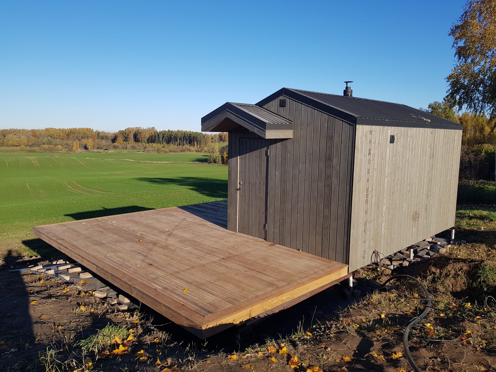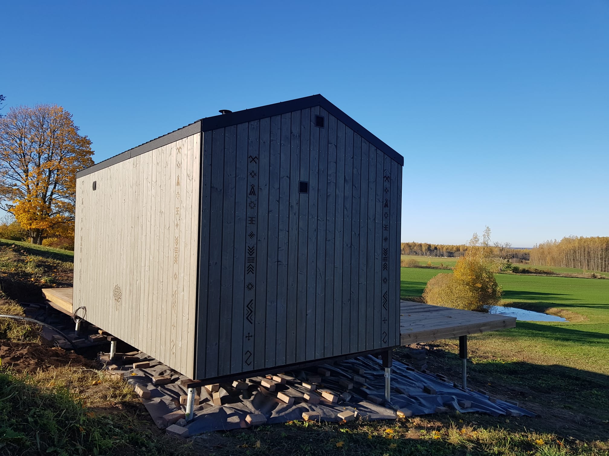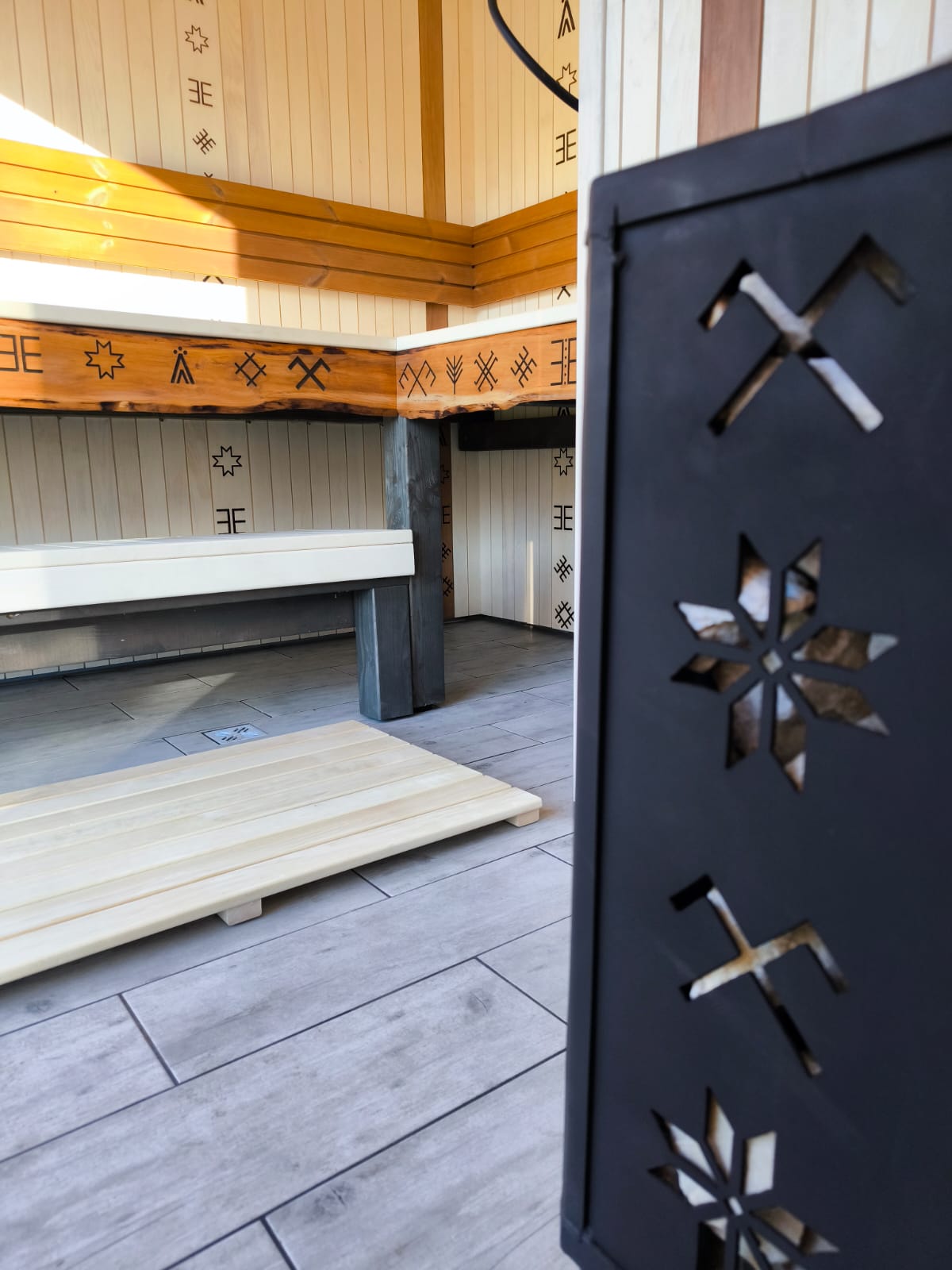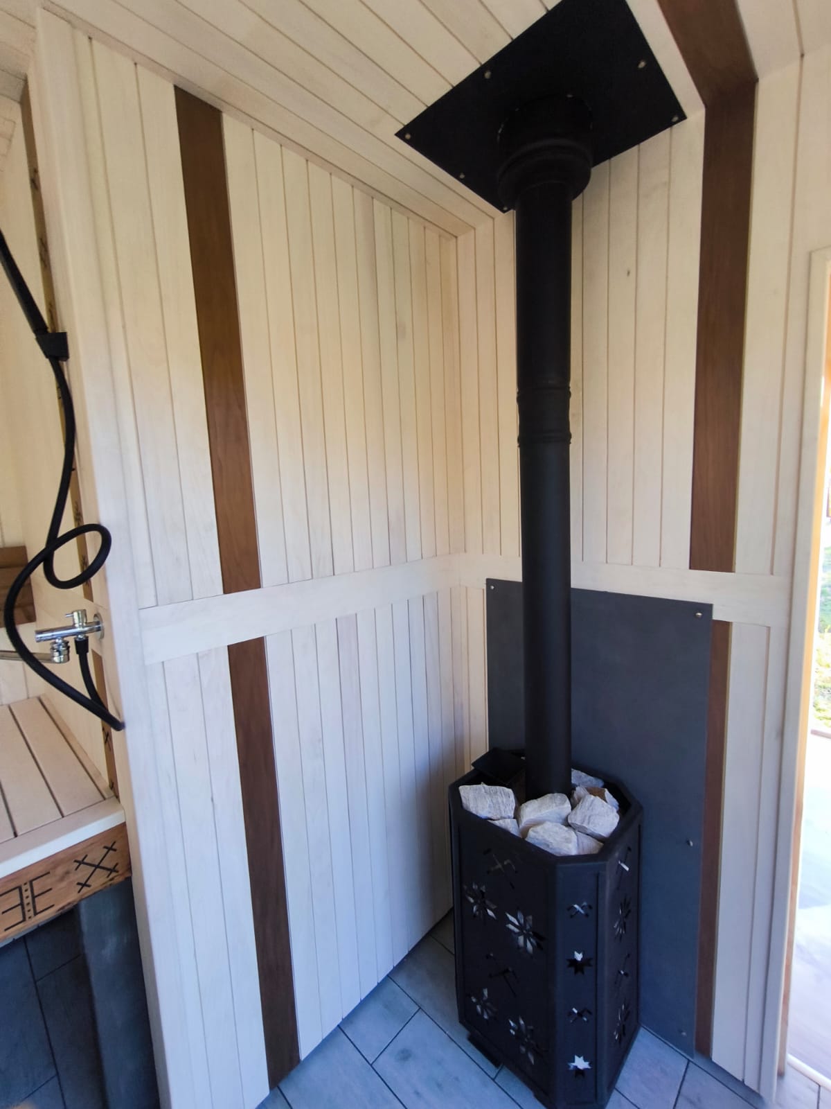 Neliela, askētiska pirts, kas izgatavota no 45x95mm bieza kalibrēta kokmateriāla un 100mm minerālvates. Augstas kvalitātes grafīta apdare, smalki zāģēti apdares dēļi ārējā apdarē. Follija siltuma atstarojoša izolācija pirts telpā. Lapu koka (liepas) apdare pirts telpā – tonēta balta un termokoka dēļi akcentam. Pirts telpā akmens masas flīžu grīdas segums, kritums uz trapu. Lapu koka (liepas) lāvas ar dekoratīviem gravējumiem melnalkšņa dēlī. Atpūtas telpā bērza saplākšņa apdare tonēta balta un pelēka, grīdā – lamināta segums (33.noturības klase). Lieli vitrīnas logi ar tonējošu 95% spoguļplēvi. Metāla jumta segums ar poliuretāna pārklājumu. Dušas telpā kompozītmateriāla sienas apdare, akmens masas flīžu grīdas segums, telpa aprīkota ar dušu un attālināti vadāmu boileri ar pretaizsalšanas funkciju. Ūdens sistēmas caurules aprīkotas ar sildošo vadu, pasargājot no ūdens cauruļu sasalšanas. Malkas pirts krāsns, ražota Latvijā pēc TANTUM pasūtījuma. Nerūsējoša tērauda skurstenis. Divpunktu dabīgā ventilācija. Dekoratīvi latvju rakstu un dabas elementu gravējumi. LED gaismas lampas ar dizaina elementiem.