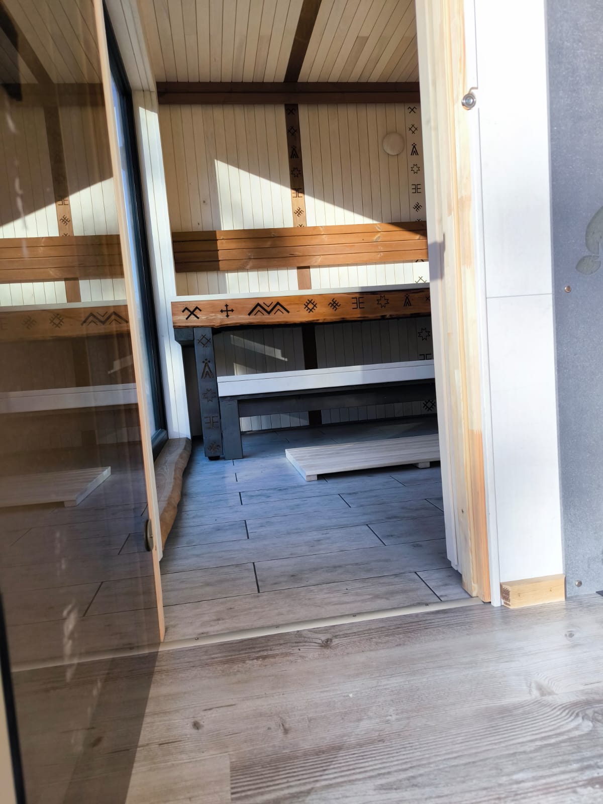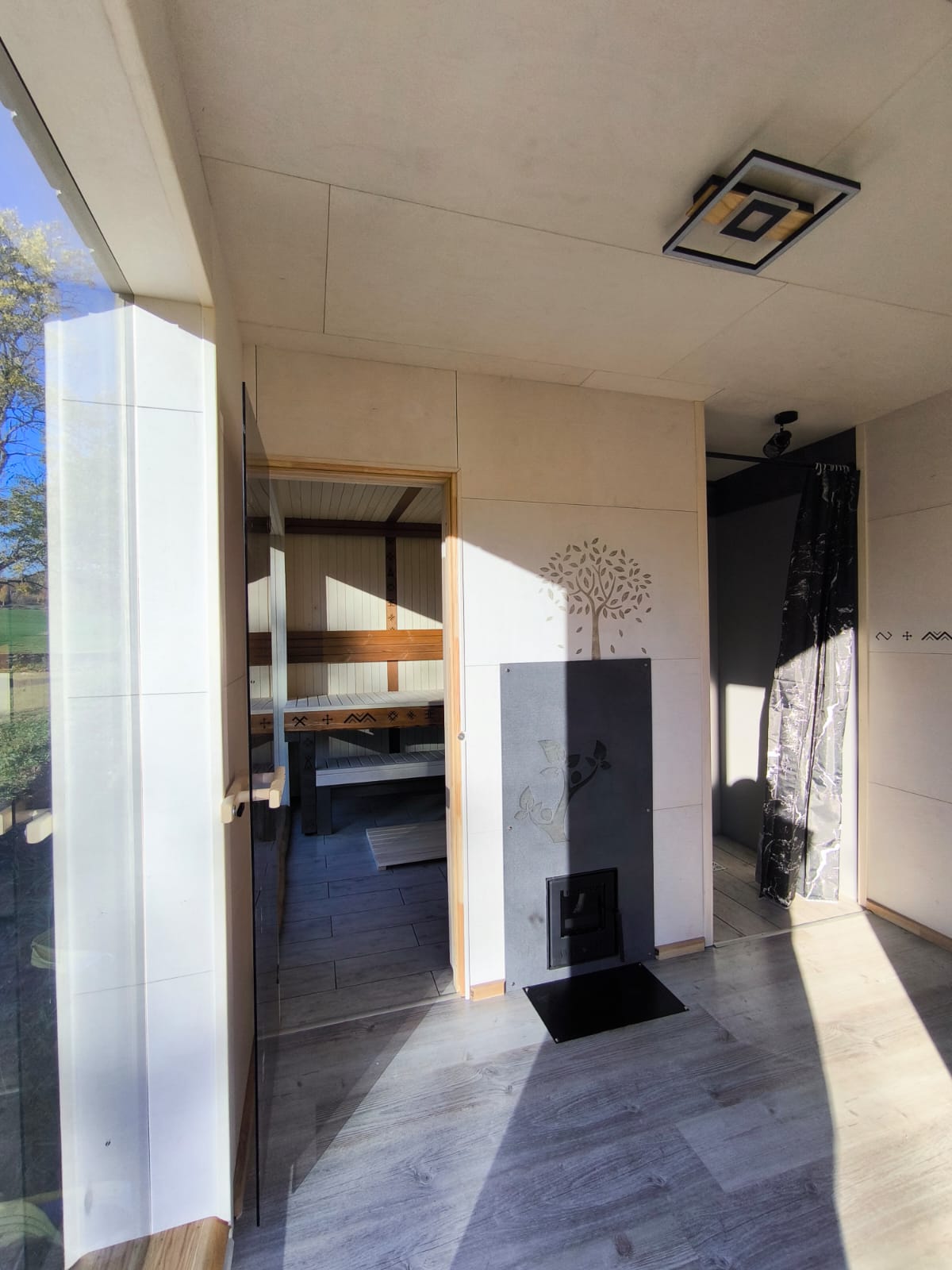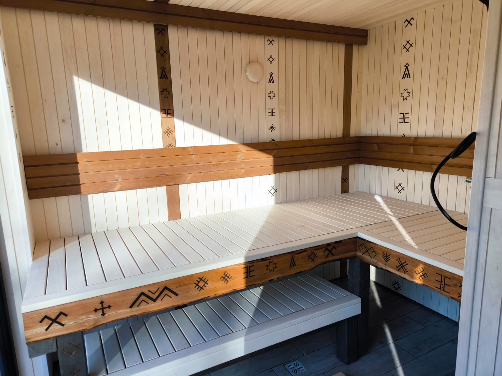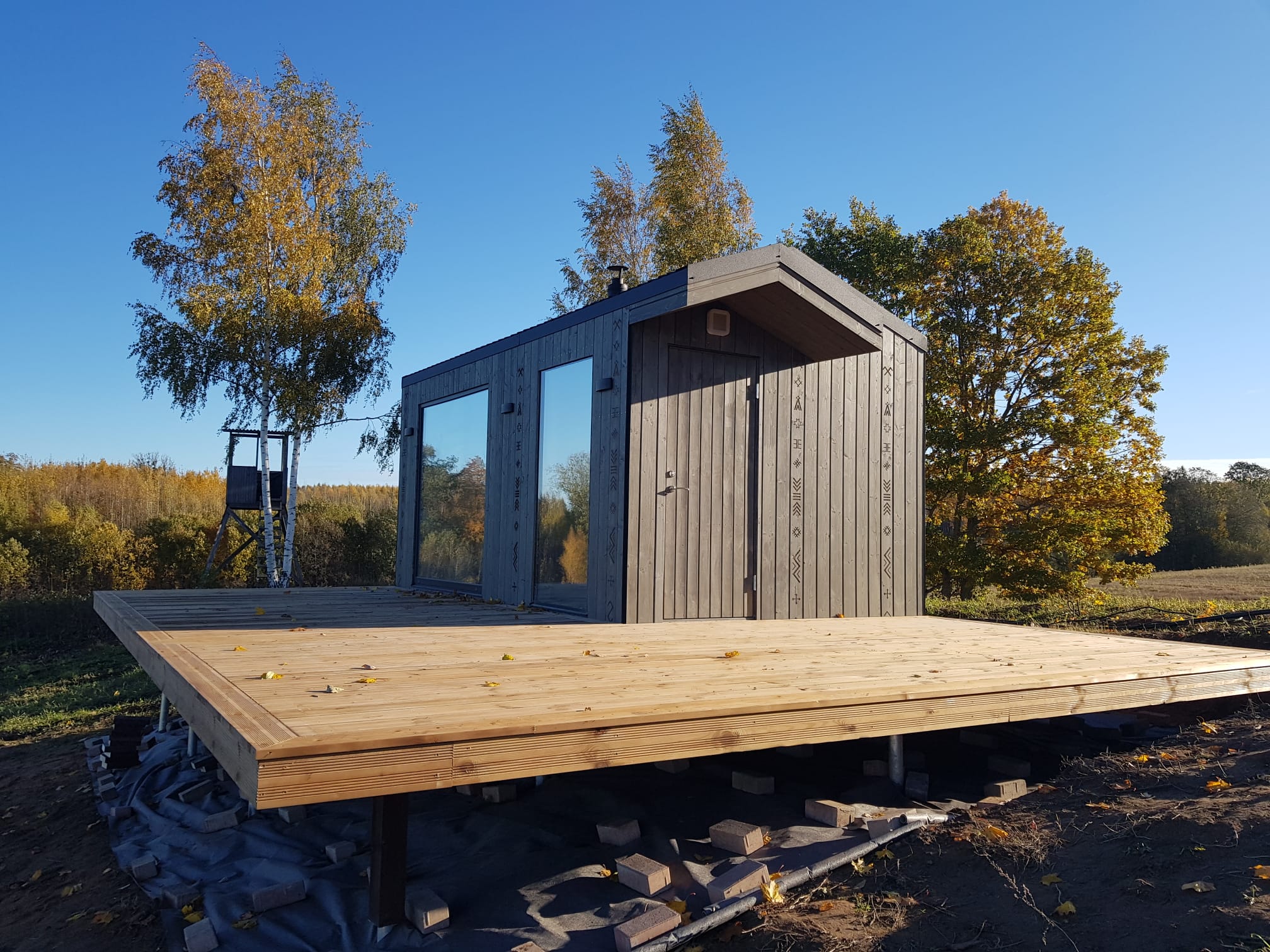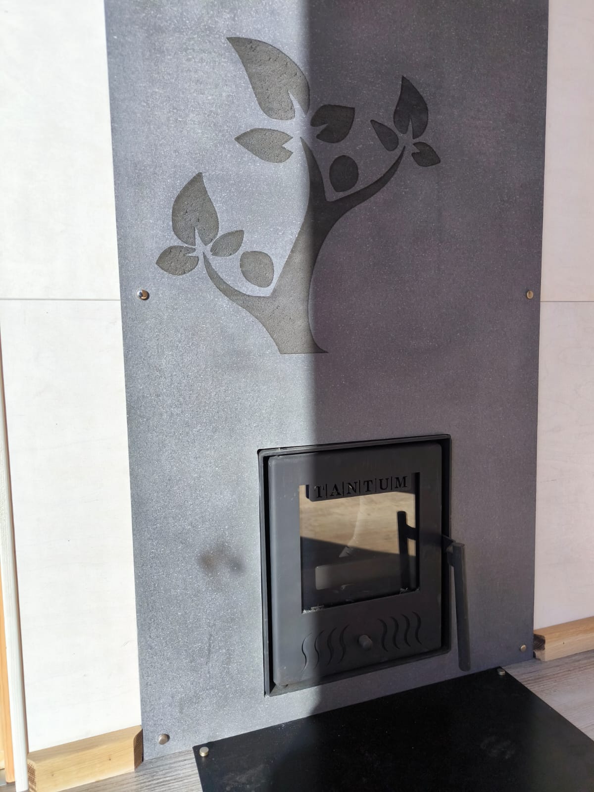 Neliela, askētiska pirts, kas izgatavota no 45x95mm bieza kalibrēta kokmateriāla un 100mm minerālvates. Augstas kvalitātes grafīta apdare, smalki zāģēti apdares dēļi ārējā apdarē. Follija siltuma atstarojoša izolācija pirts telpā. Lapu koka (liepas) apdare pirts telpā – tonēta balta un termokoka dēļi akcentam. Pirts telpā akmens masas flīžu grīdas segums, kritums uz trapu. Lapu koka (liepas) lāvas ar dekoratīviem gravējumiem melnalkšņa dēlī. Atpūtas telpā bērza saplākšņa apdare tonēta balta un pelēka, grīdā – lamināta segums (33.noturības klase). Lieli vitrīnas logi ar tonējošu 95% spoguļplēvi. Metāla jumta segums ar poliuretāna pārklājumu. Dušas telpā kompozītmateriāla sienas apdare, akmens masas flīžu grīdas segums, telpa aprīkota ar dušu un attālināti vadāmu boileri ar pretaizsalšanas funkciju. Ūdens sistēmas caurules aprīkotas ar sildošo vadu, pasargājot no ūdens cauruļu sasalšanas. Malkas pirts krāsns, ražota Latvijā pēc TANTUM pasūtījuma. Nerūsējoša tērauda skurstenis. Divpunktu dabīgā ventilācija. Dekoratīvi latvju rakstu un dabas elementu gravējumi. LED gaismas lampas ar dizaina elementiem.