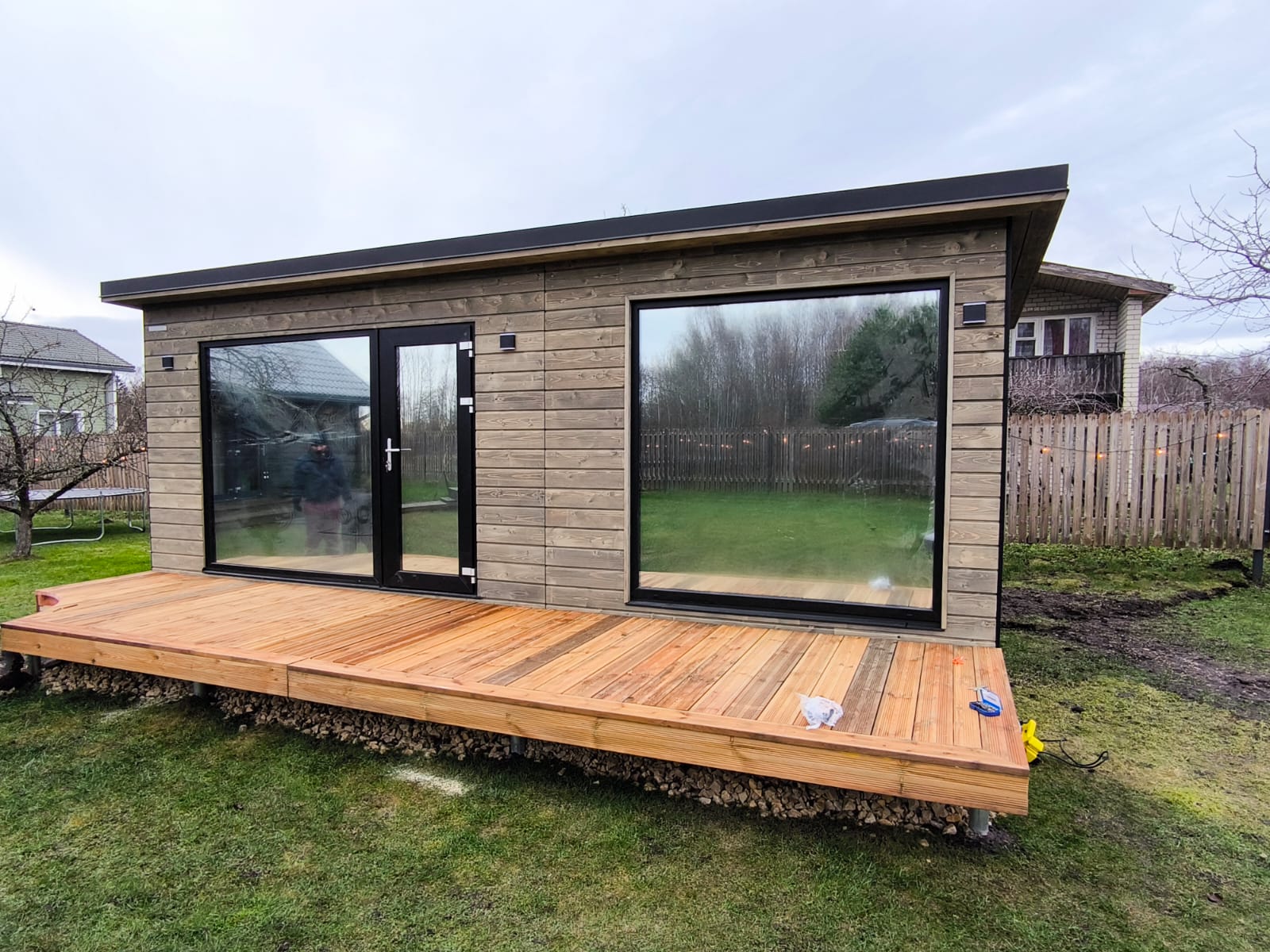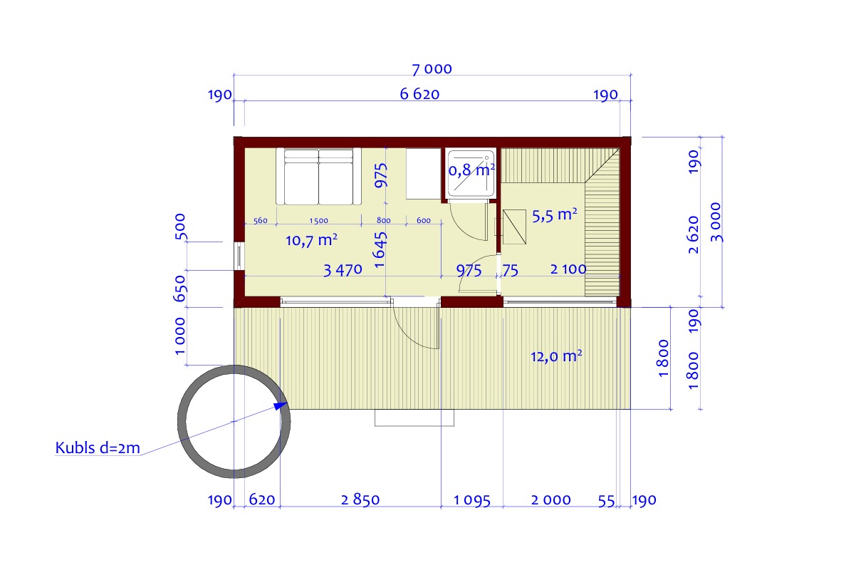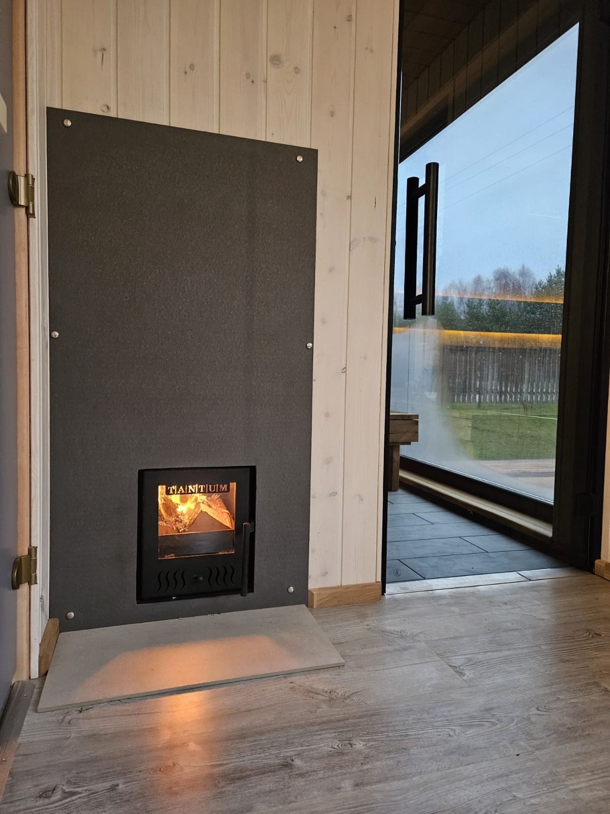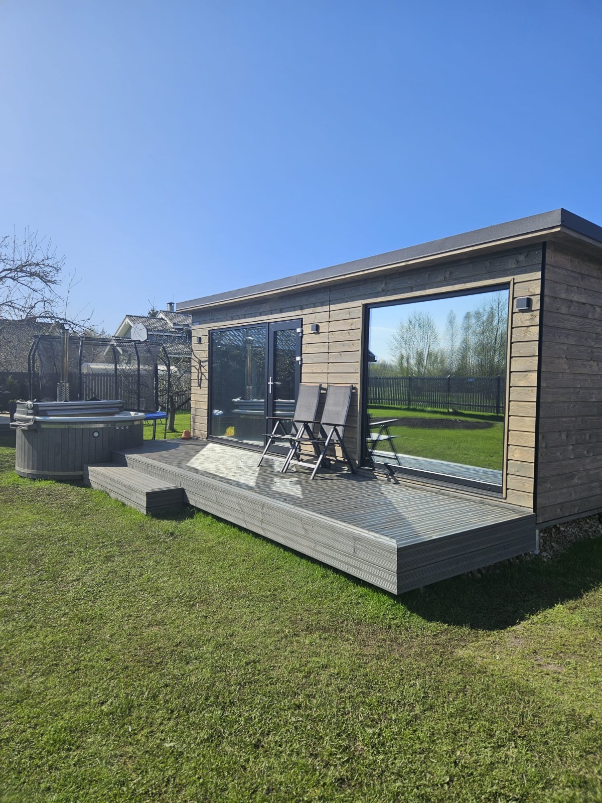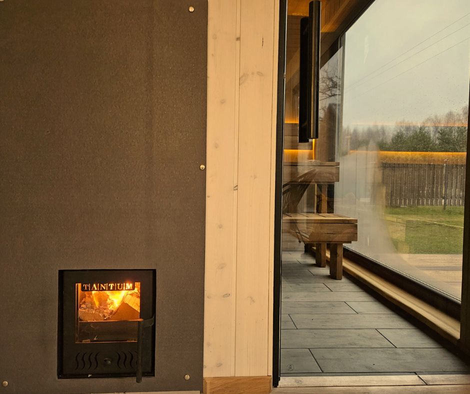 Neliela, askētiska pirts, kas izgatavota no 45x95mm bieza kalibrēta kokmateriāla un 100mm minerālvates. Augstas kvalitātes grafīta apdare, smalki zāģēti apdares dēļi ārējā apdarē. Follija siltuma atstarojoša izolācija pirts telpā. Pirts telpā termokoka apdare un lāvas, akmens masas flīžu grīdas segums, kritums uz trapu. Atpūtas telpā dēlīšu apdare tonēta balta, grīdā – vinila segums. Lieli vitrīnas logi ar tonējošu 95% spoguļplēvi. Metāla jumta segums ar poliuretāna pārklājumu. Dušas telpā kompozītmateriāla sienas apdare, akmens masas flīžu grīdas segums, telpa aprīkota ar dušu un attālināti vadāmu boileri ar pretaizsalšanas funkciju. Ūdens sistēmas caurules aprīkotas ar sildošo vadu, pasargājot no ūdens cauruļu sasalšanas. Malkas pirts krāsns, ražota Latvijā pēc TANTUM pasūtījuma. Nerūsējoša tērauda skurstenis. Divpunktu dabīgā ventilācija. LED gaismas lampas ar dizaina elementiem.