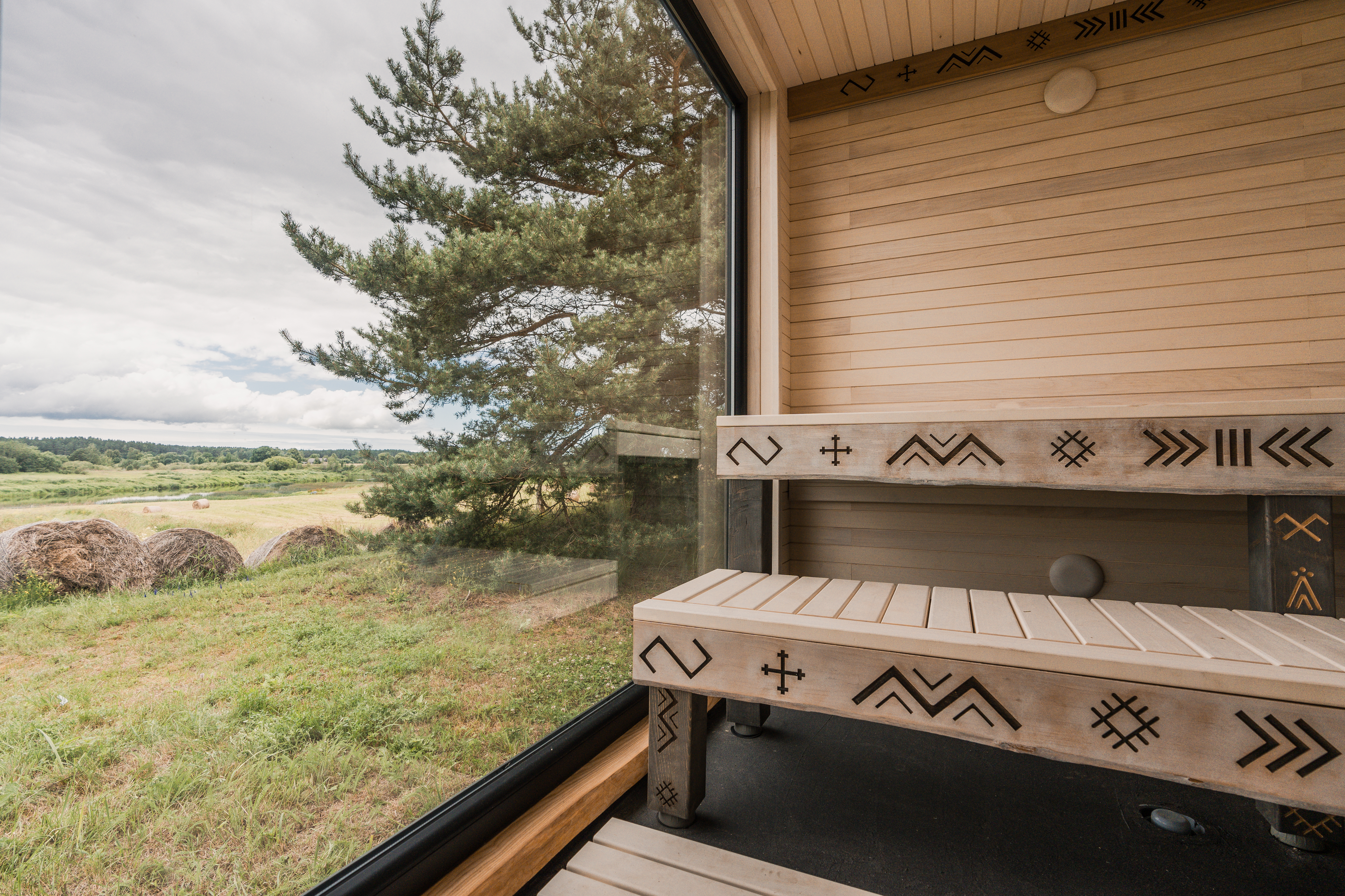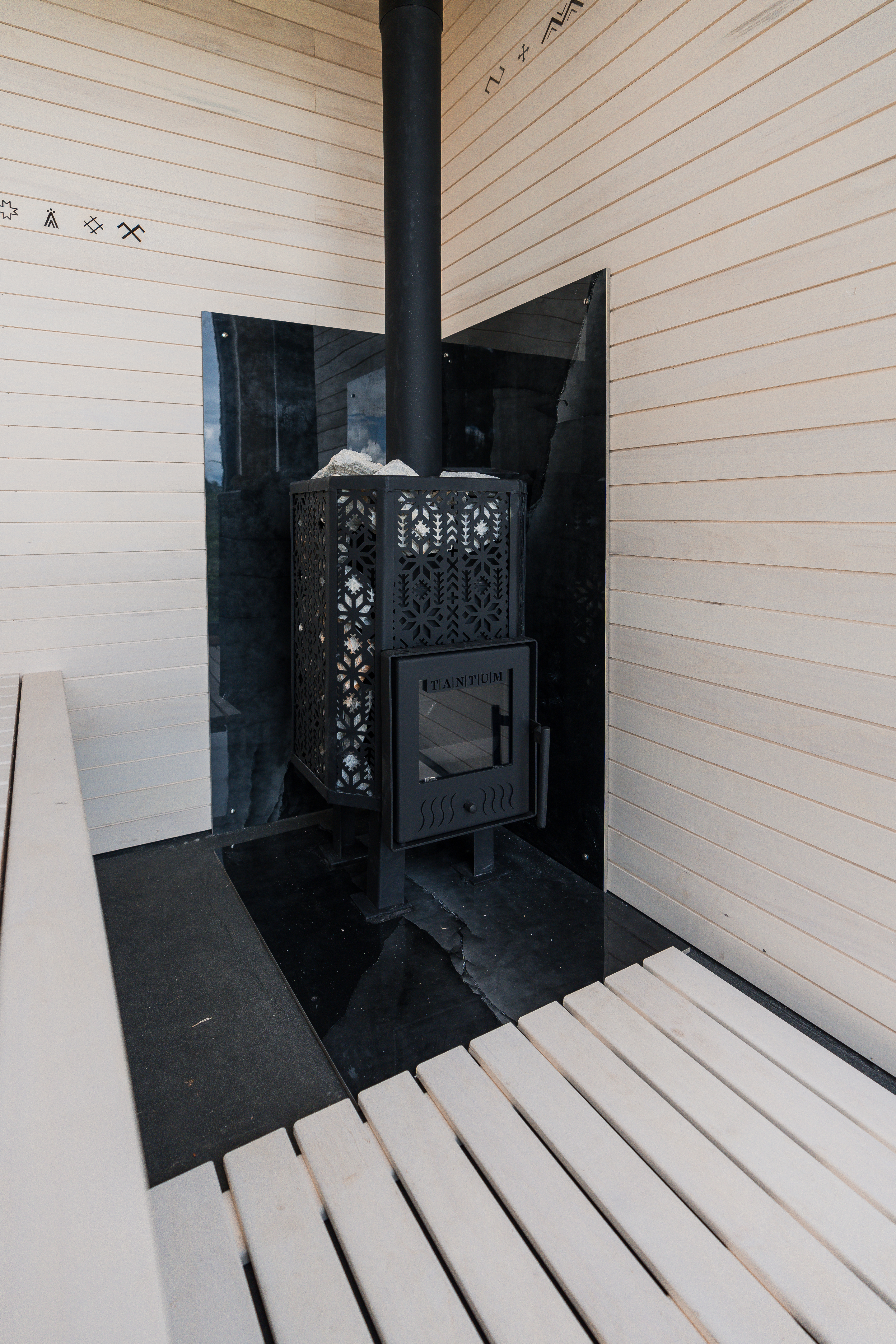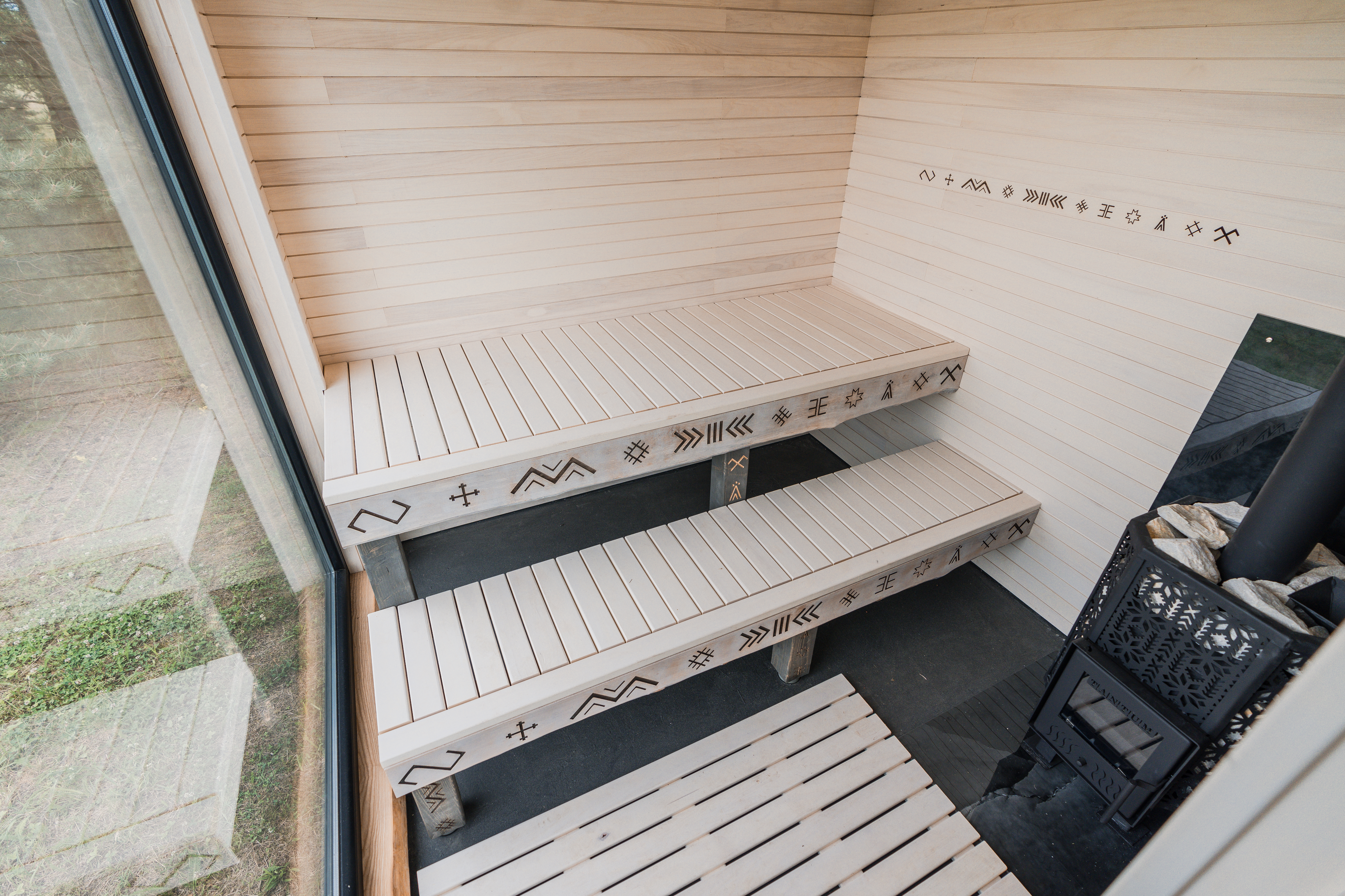 Neliela, askētiska pirts, kas izgatavota no 50x100mm bieza kokmateriāla un 100mm minerālvates. Augstas kvalitates grafīta apdare, smalki zāģēti apdares dēļi ārējā apdarē. Follija siltuma atstarojoša izolācija pirts telpā. Dubultā hidroizolācija pirts grīdā, kritums uz trapu. Lapu koka apdare pirts telpā – tonēta balta. Flīžu un lamināta grīdas segums. Bērza saplākšņa apdare atpūtas telpā, tonēta balta. Lieli logi ar spoguļtonējumu. Koka lubiņu jumta segums. Atsevišķa dušas un tualetes telpas. Latvijā ražota kvalitatīva malkas krāsns. Papildus izbūvēta lofta 5m2.