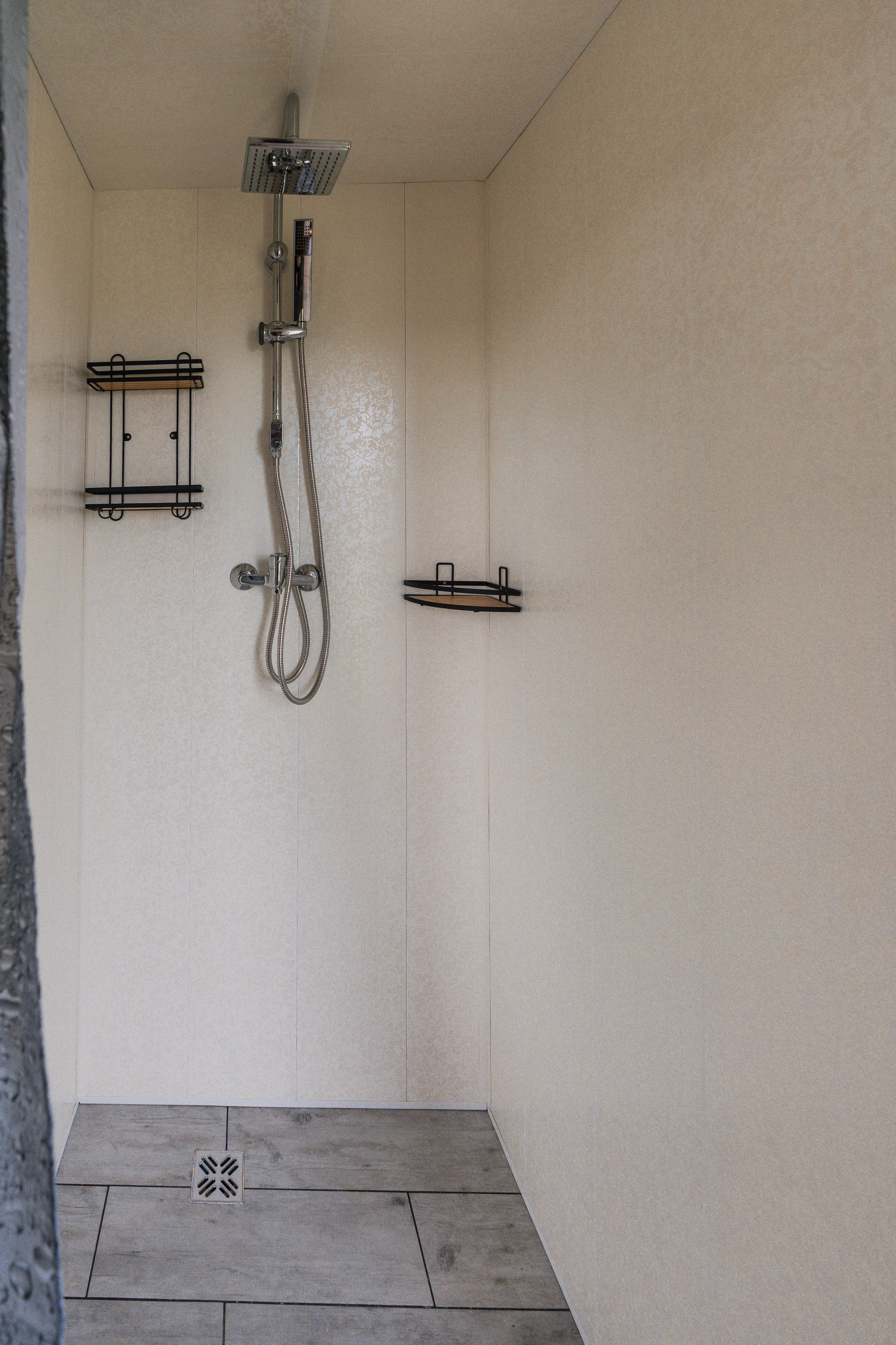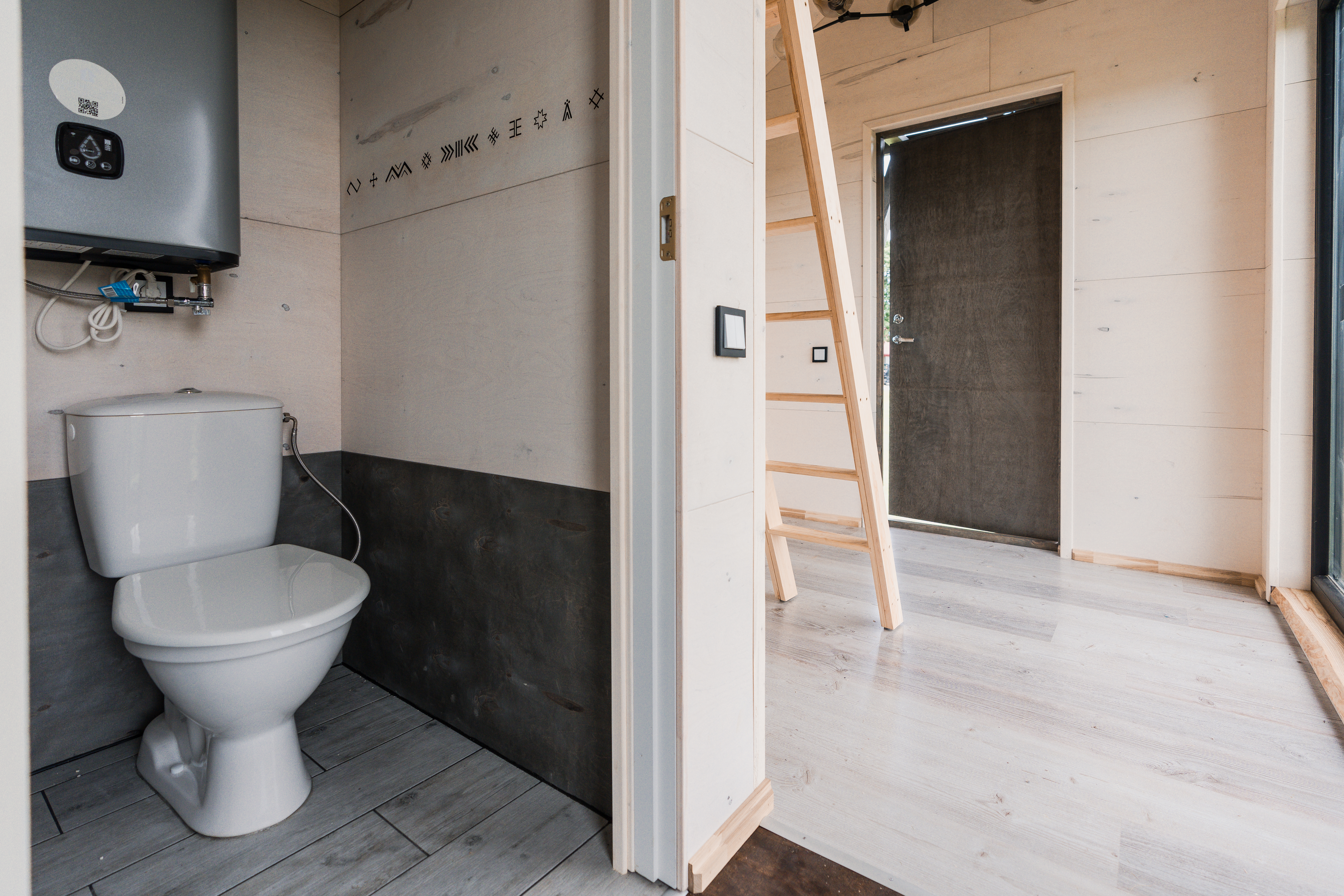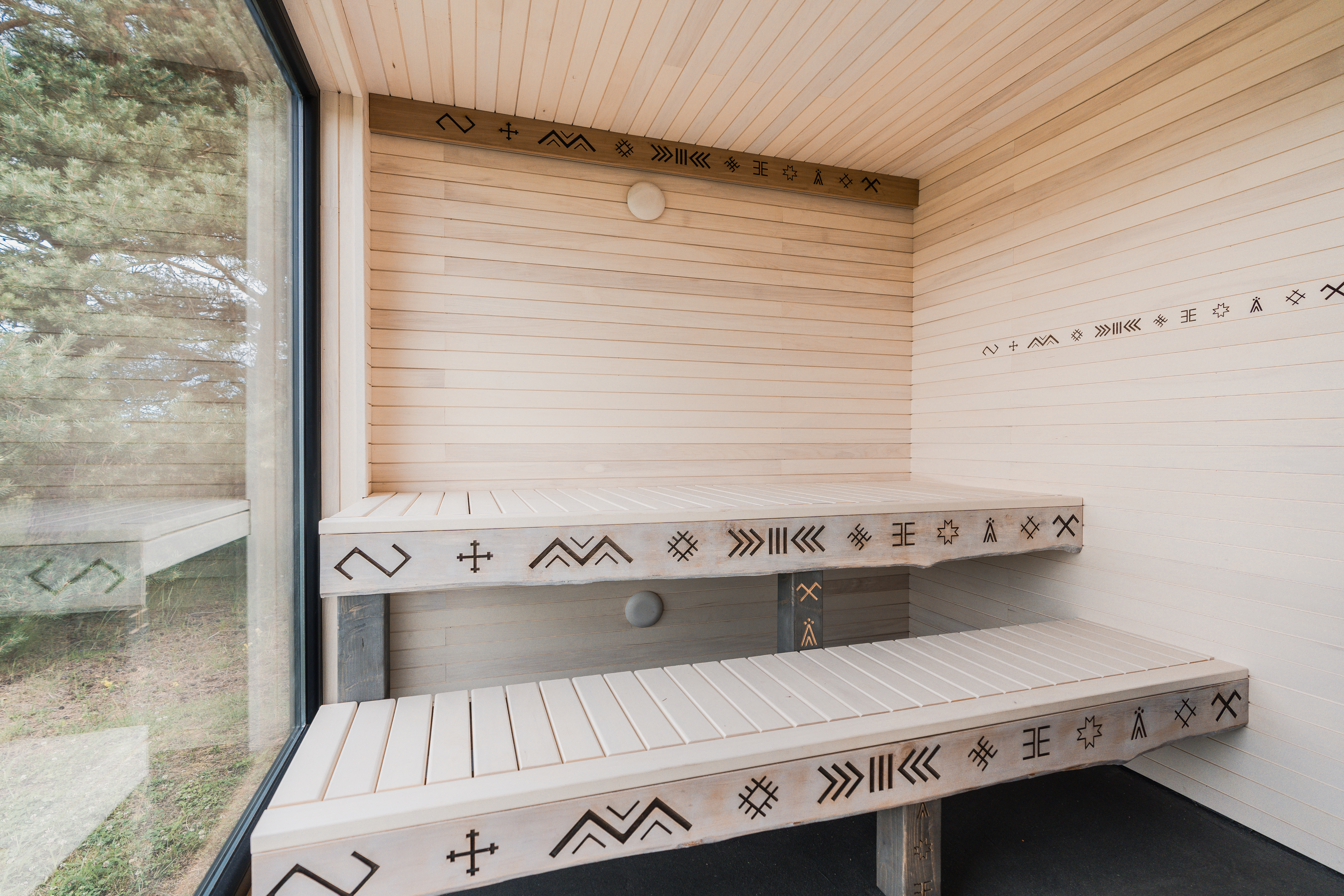 Neliela, askētiska pirts, kas izgatavota no 50x100mm bieza kokmateriāla un 100mm minerālvates. Augstas kvalitates grafīta apdare, smalki zāģēti apdares dēļi ārējā apdarē. Follija siltuma atstarojoša izolācija pirts telpā. Dubultā hidroizolācija pirts grīdā, kritums uz trapu. Lapu koka apdare pirts telpā – tonēta balta. Flīžu un lamināta grīdas segums. Bērza saplākšņa apdare atpūtas telpā, tonēta balta. Lieli logi ar spoguļtonējumu. Koka lubiņu jumta segums. Atsevišķa dušas un tualetes telpas. Latvijā ražota kvalitatīva malkas krāsns. Papildus izbūvēta lofta 5m2.
