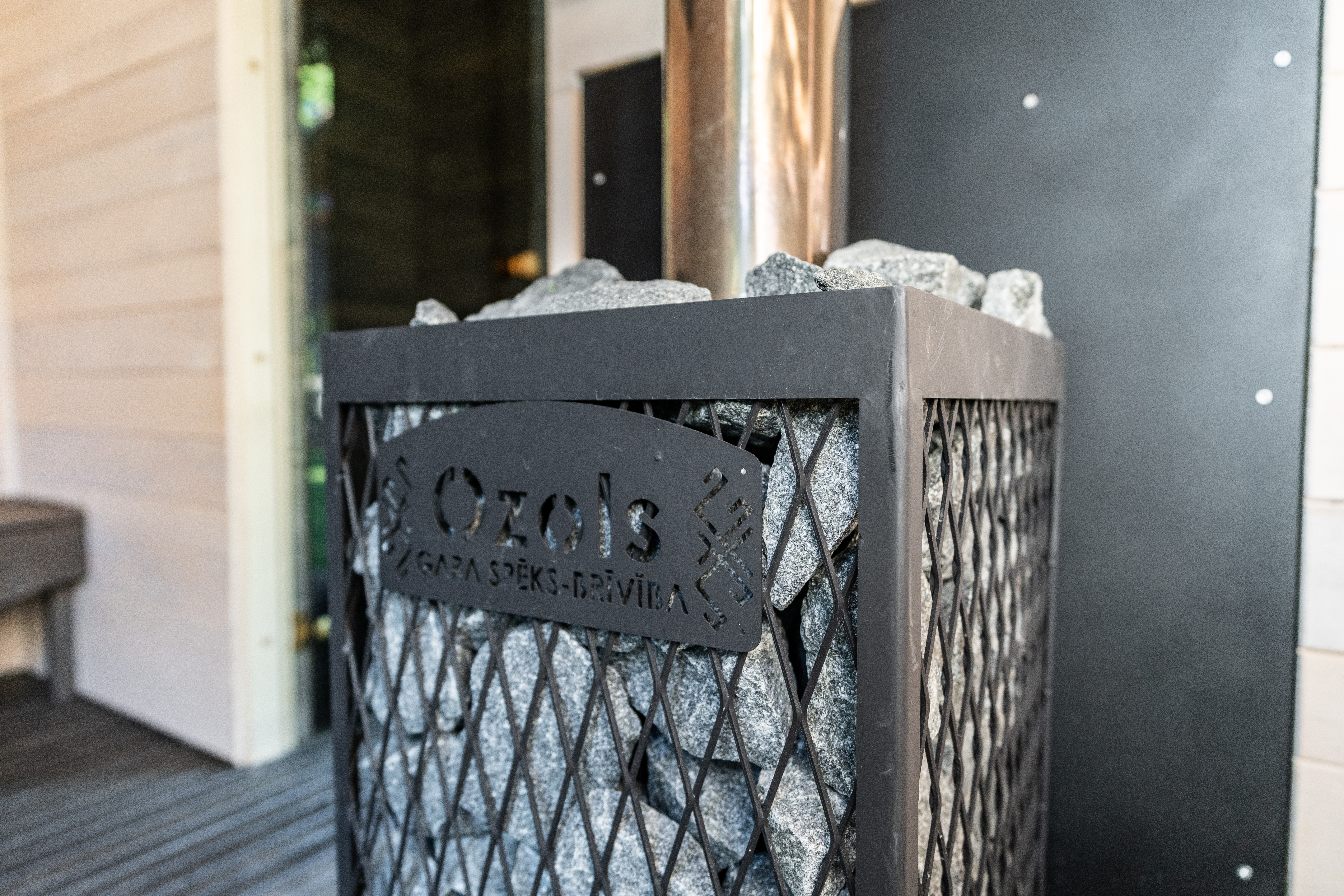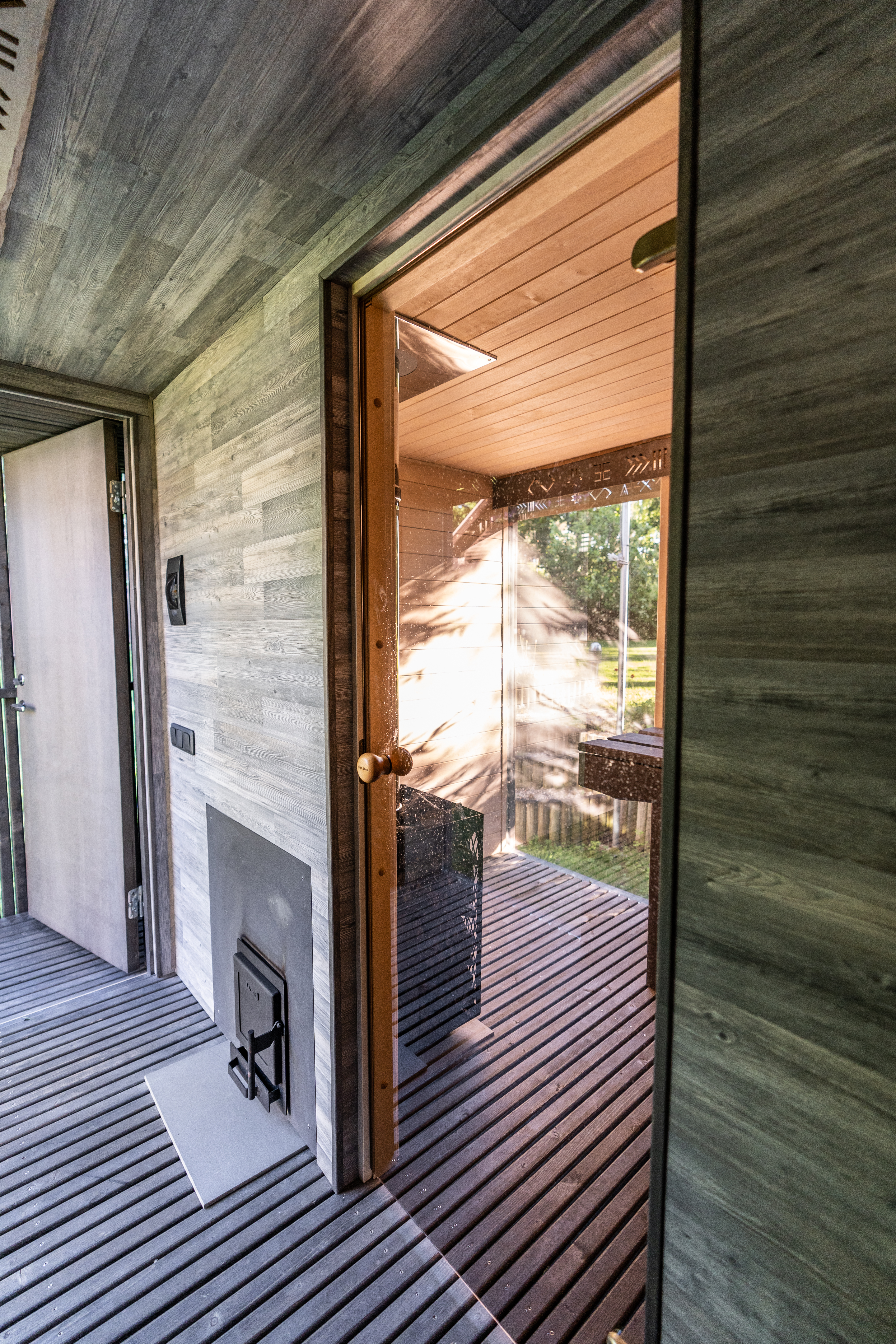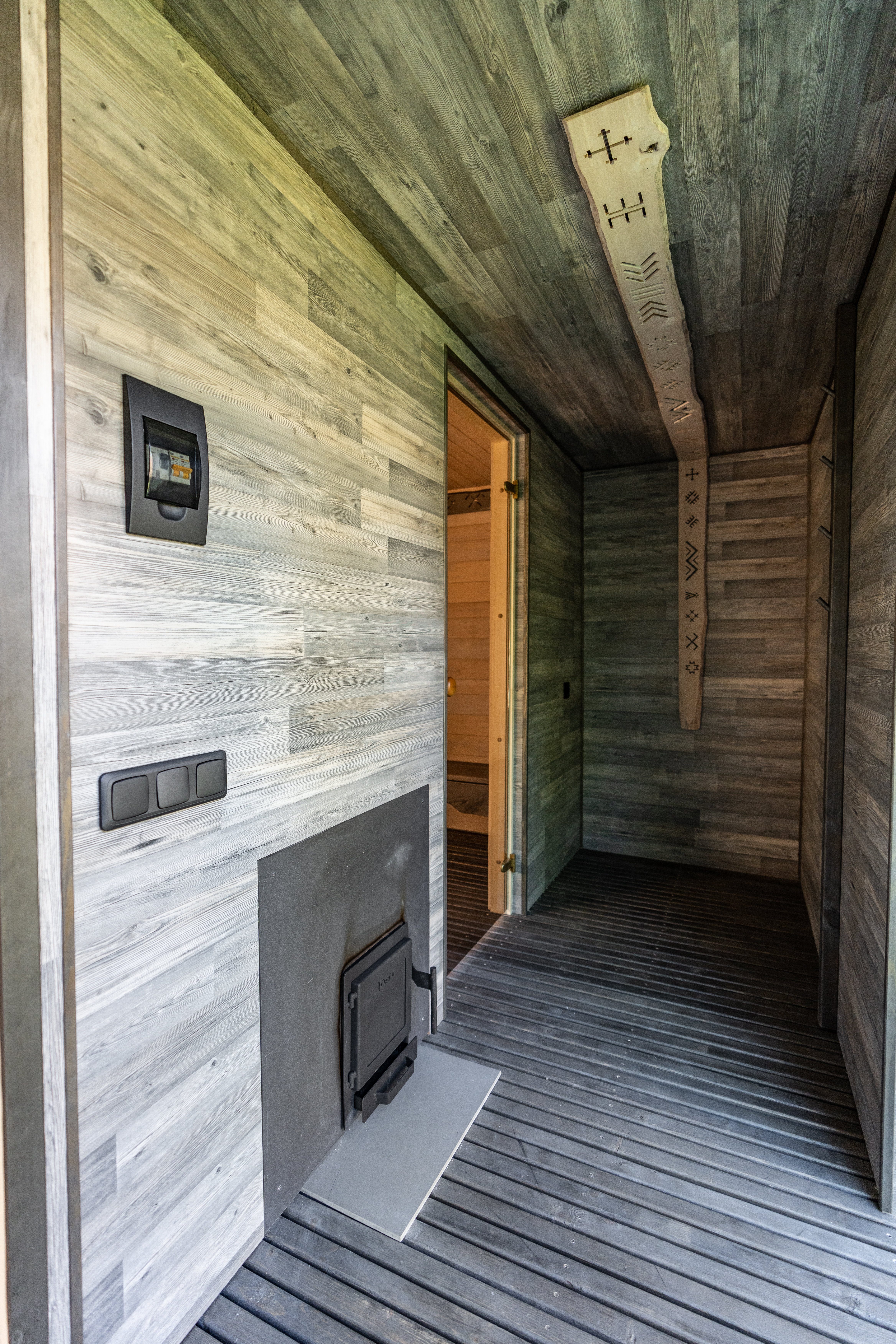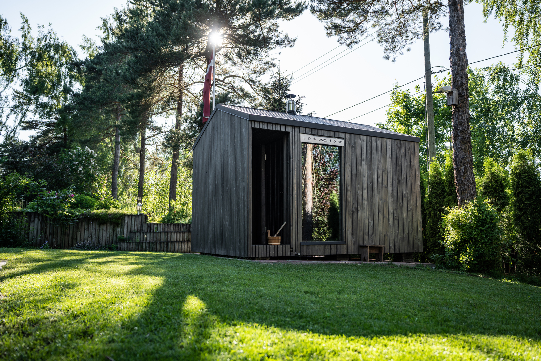 Small, ascetic sauna. Made from 50x100mm timber frame and 100mm mineralwool. High quality graphite finish, foil heat reflective insulation in the sauna room. Double hydro-insulation in the sauna floor, slope to the drain. Linden wood in the sauna room – stained white. One level united floor without thresholds, made from 45x45mm calibrated timber. LED lights in black alder boards. Large mirror type tinted windows. Enclosed outdoor shower. Metal profiled roof covering, anthracite colour.