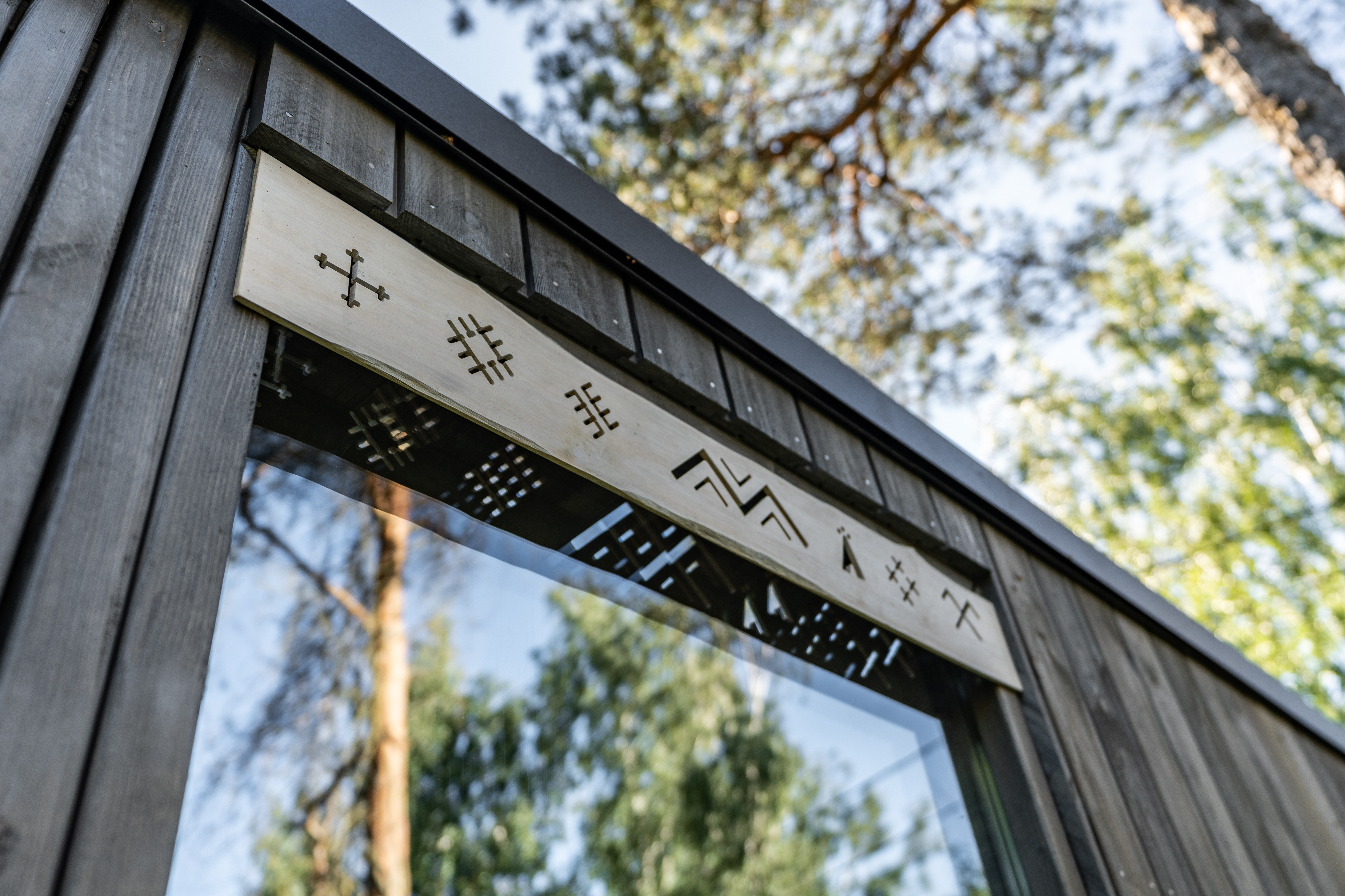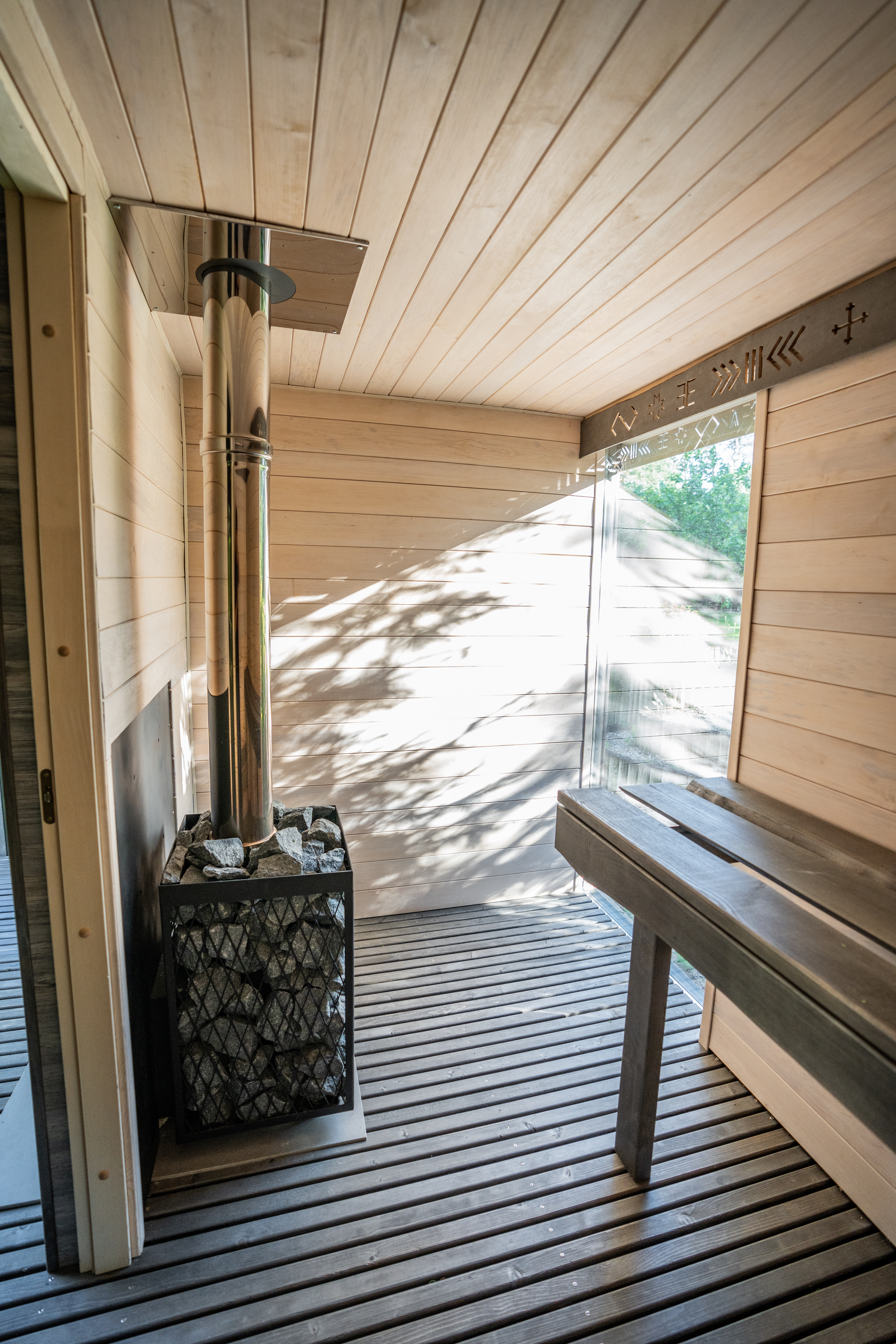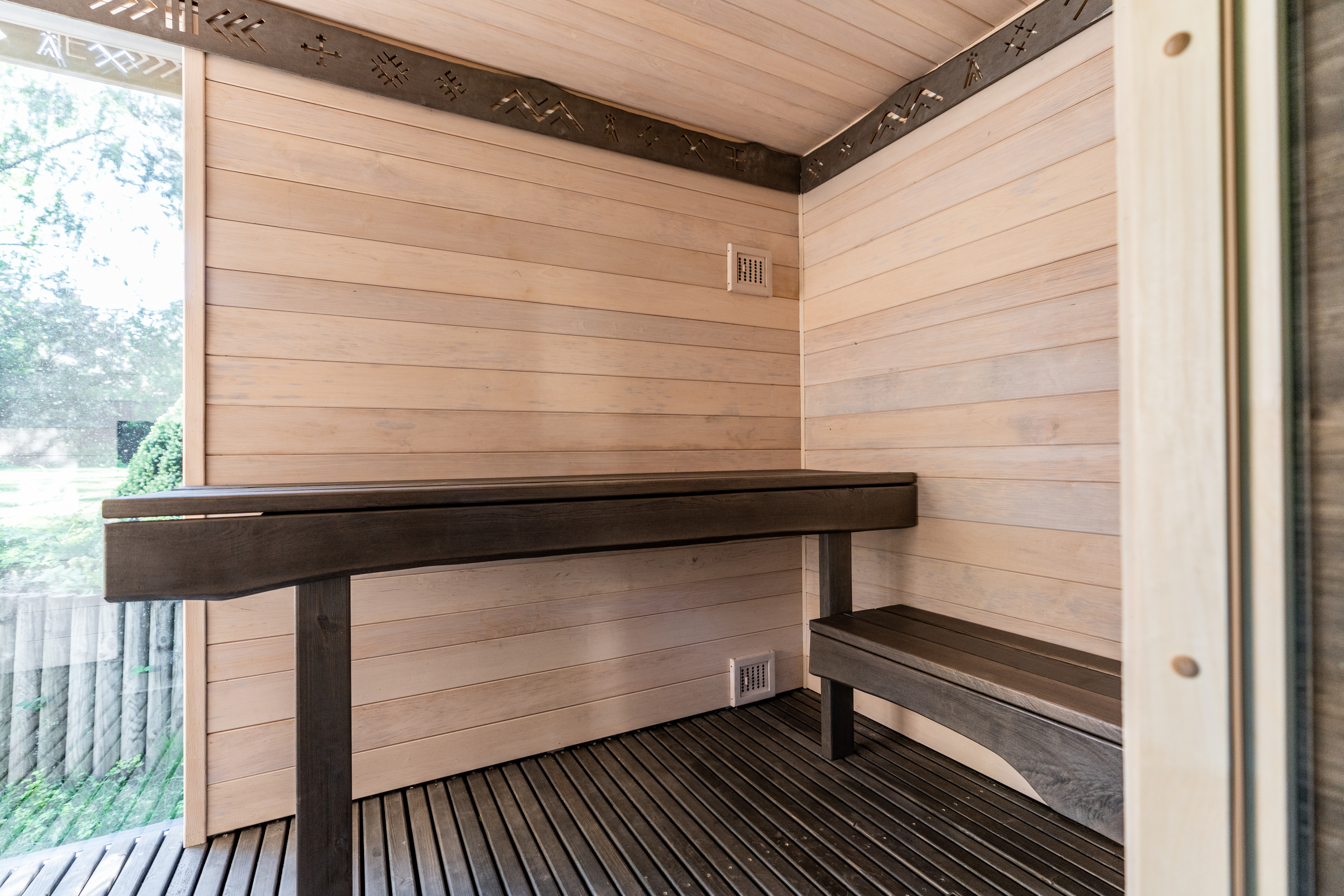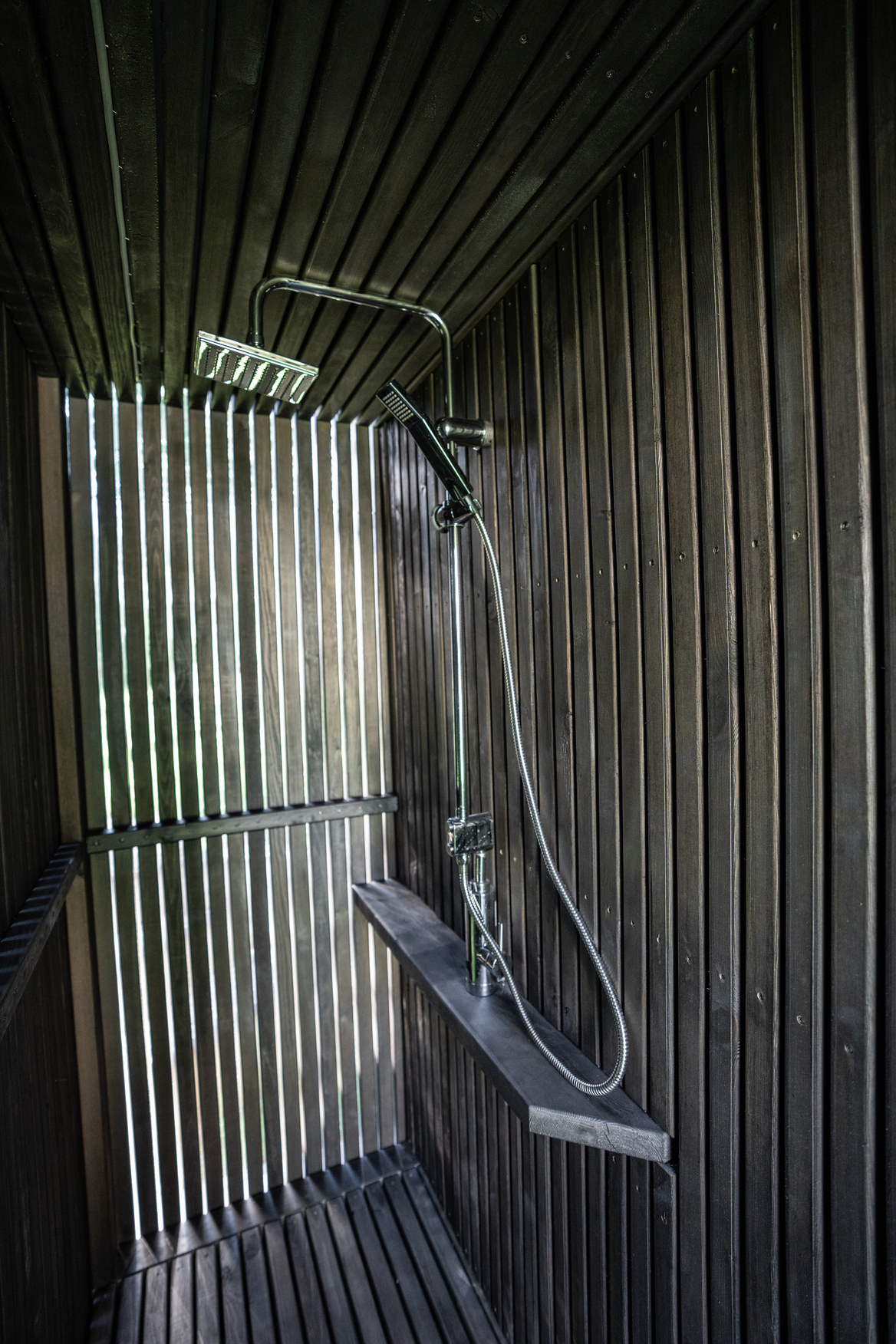 Small, ascetic sauna. Made from 50x100mm timber frame and 100mm mineralwool. High quality graphite finish, foil heat reflective insulation in the sauna room. Double hydro-insulation in the sauna floor, slope to the drain. Linden wood in the sauna room – stained white. One level united floor without thresholds, made from 45x45mm calibrated timber. LED lights in black alder boards. Large mirror type tinted windows. Enclosed outdoor shower. Metal profiled roof covering, anthracite colour.