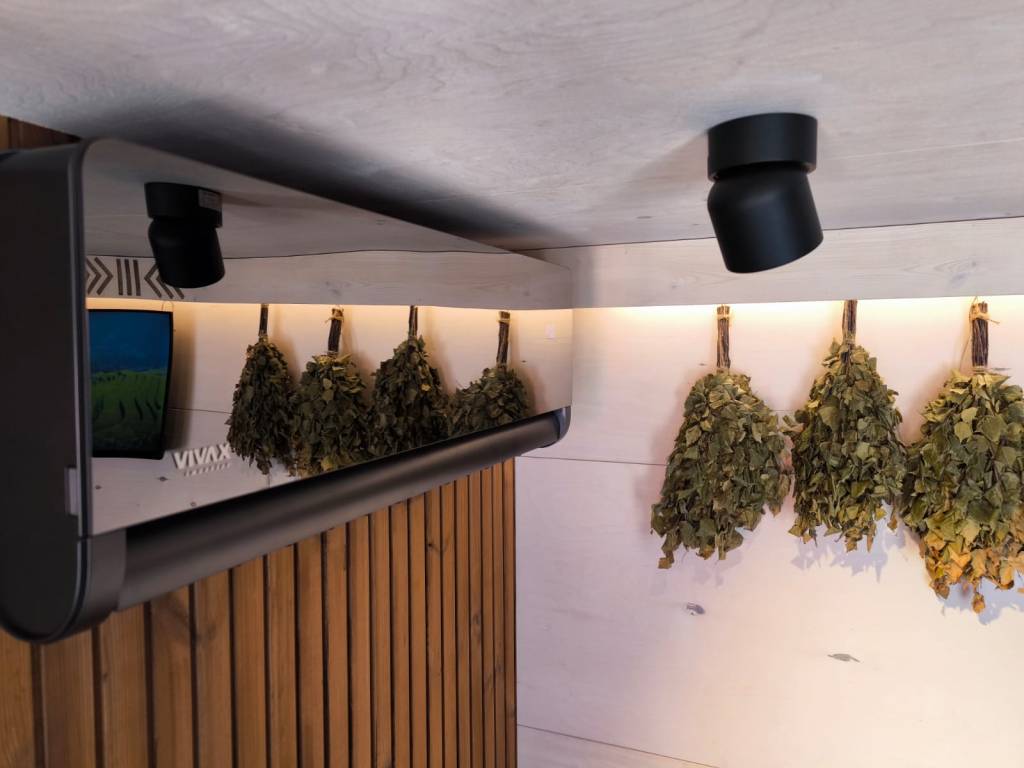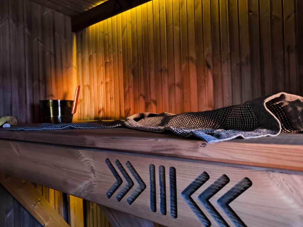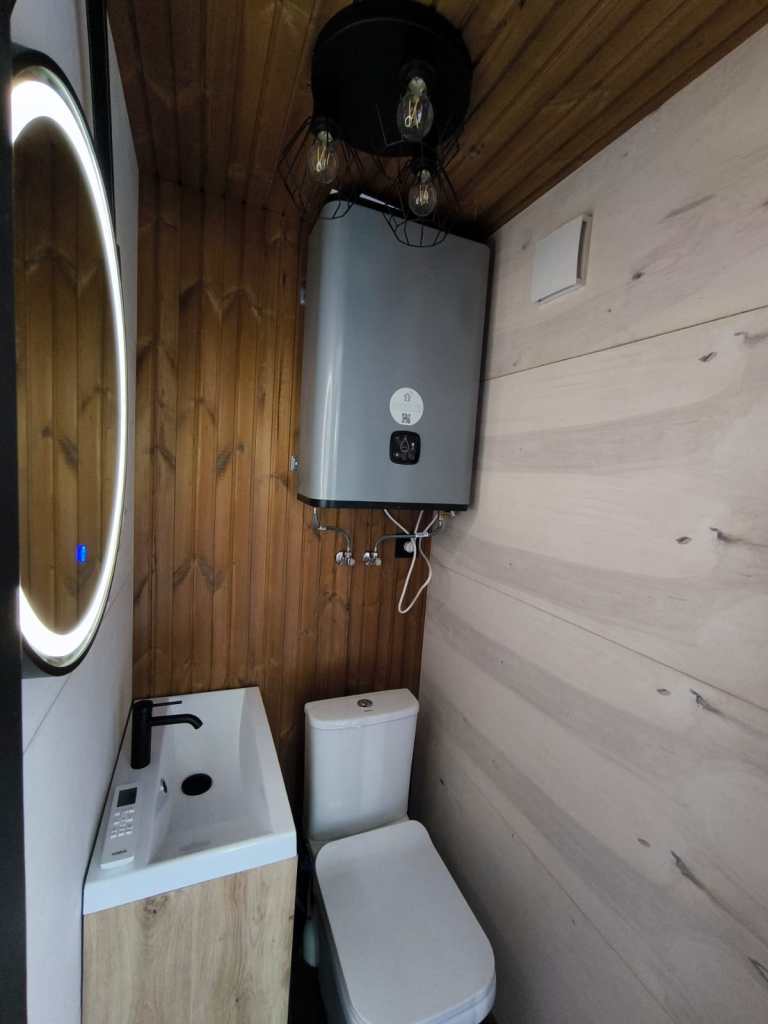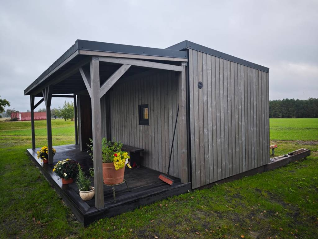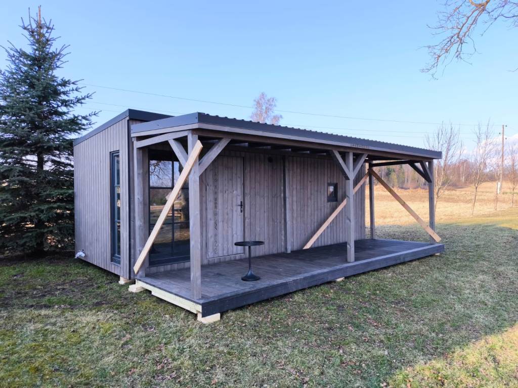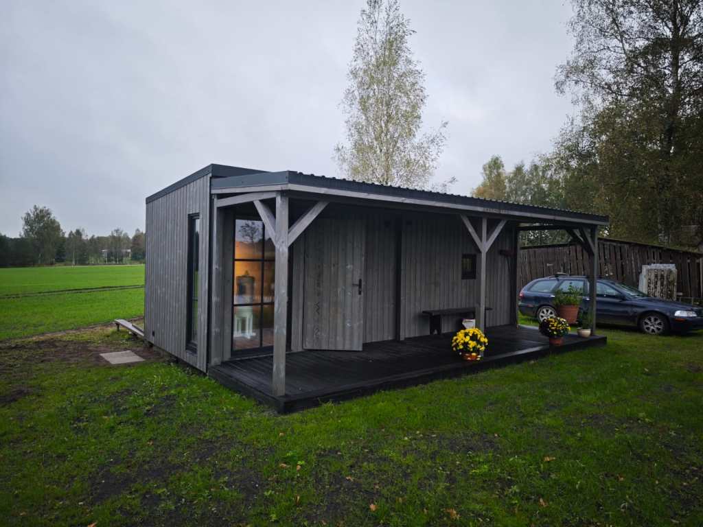 Small, ascetic sauna. Made from 45x95mm calibrated timber frame and 100mm mineralwool. Sauna has been produced individually for sauna master with elevated benches for sauna rituals. High quality graphite finish, foil heat reflective insulation in the sauna room. The sauna floor covered with tiles, slope to the drain. Thermowood in the sauna room. Plywood in living room. LED design lights. Large mirror type tinted windows (Possible to order mirror or matted windows). Metal roof covering. Wifi controlled water heater with antifreeze function. Waterpipes installed with heating wire. Firewood sauna heater. Proper sauna ventilation system. Every room has wifi controlled heated floors. Living room has wifi controlled air heat pump.