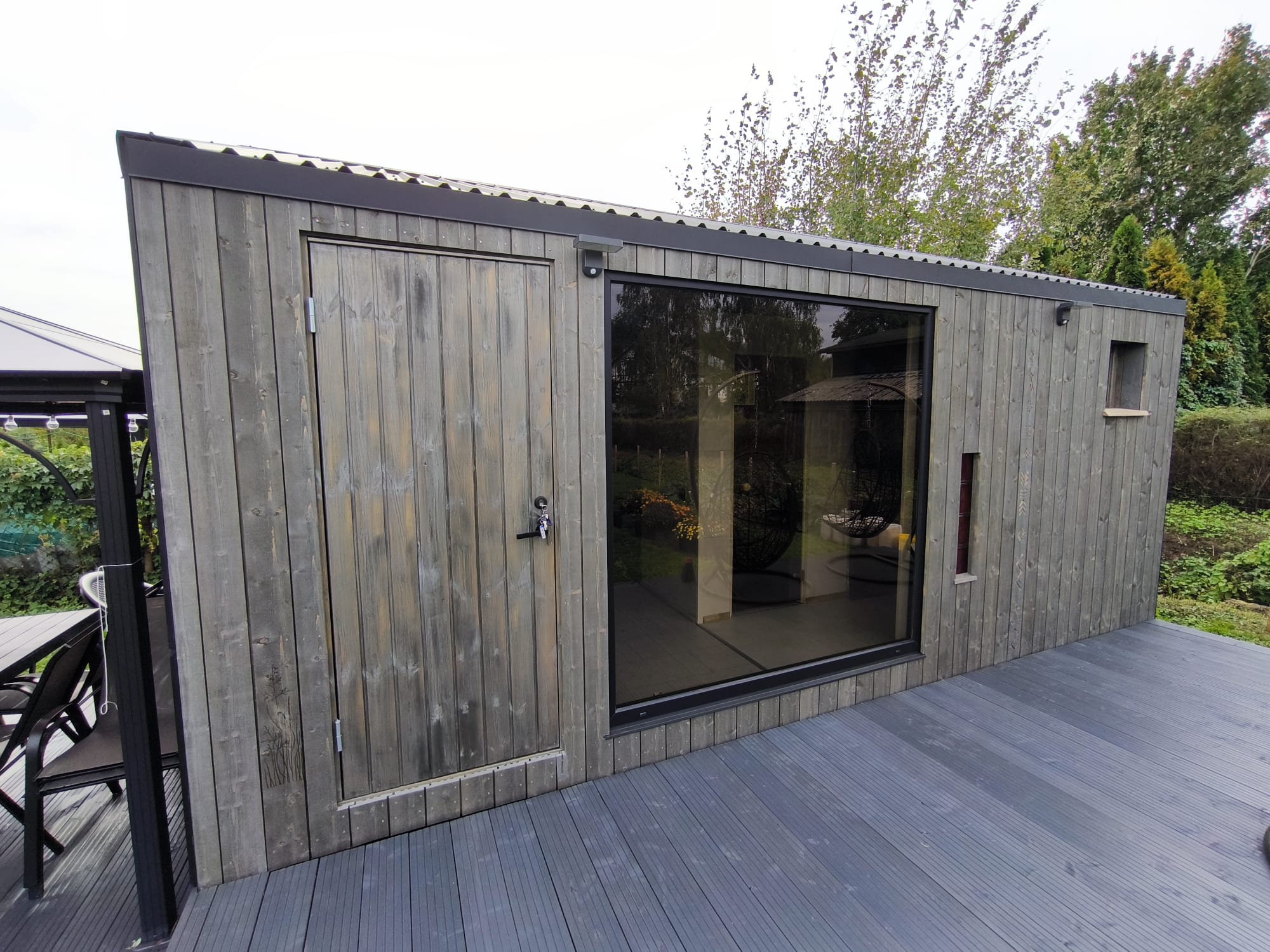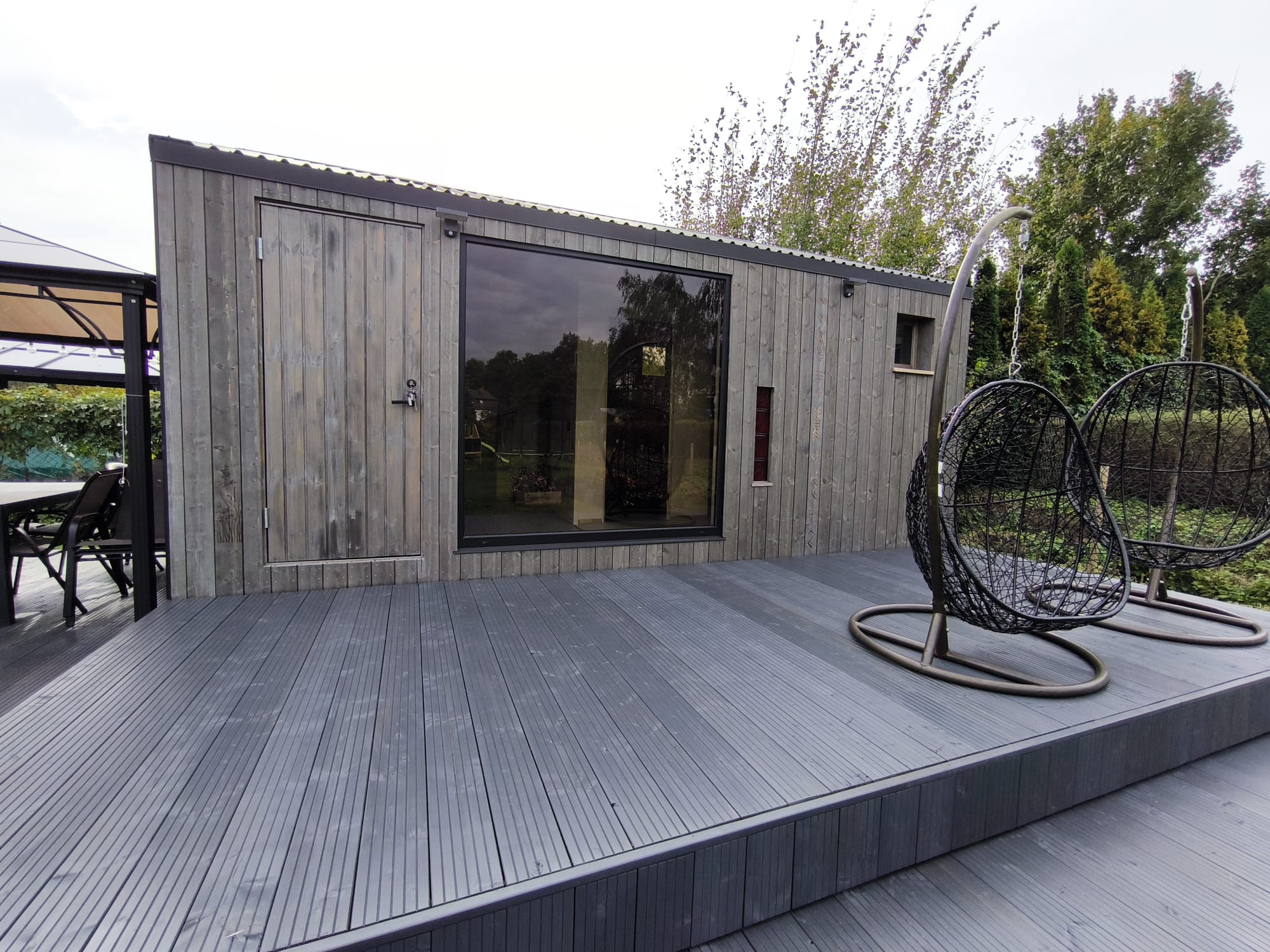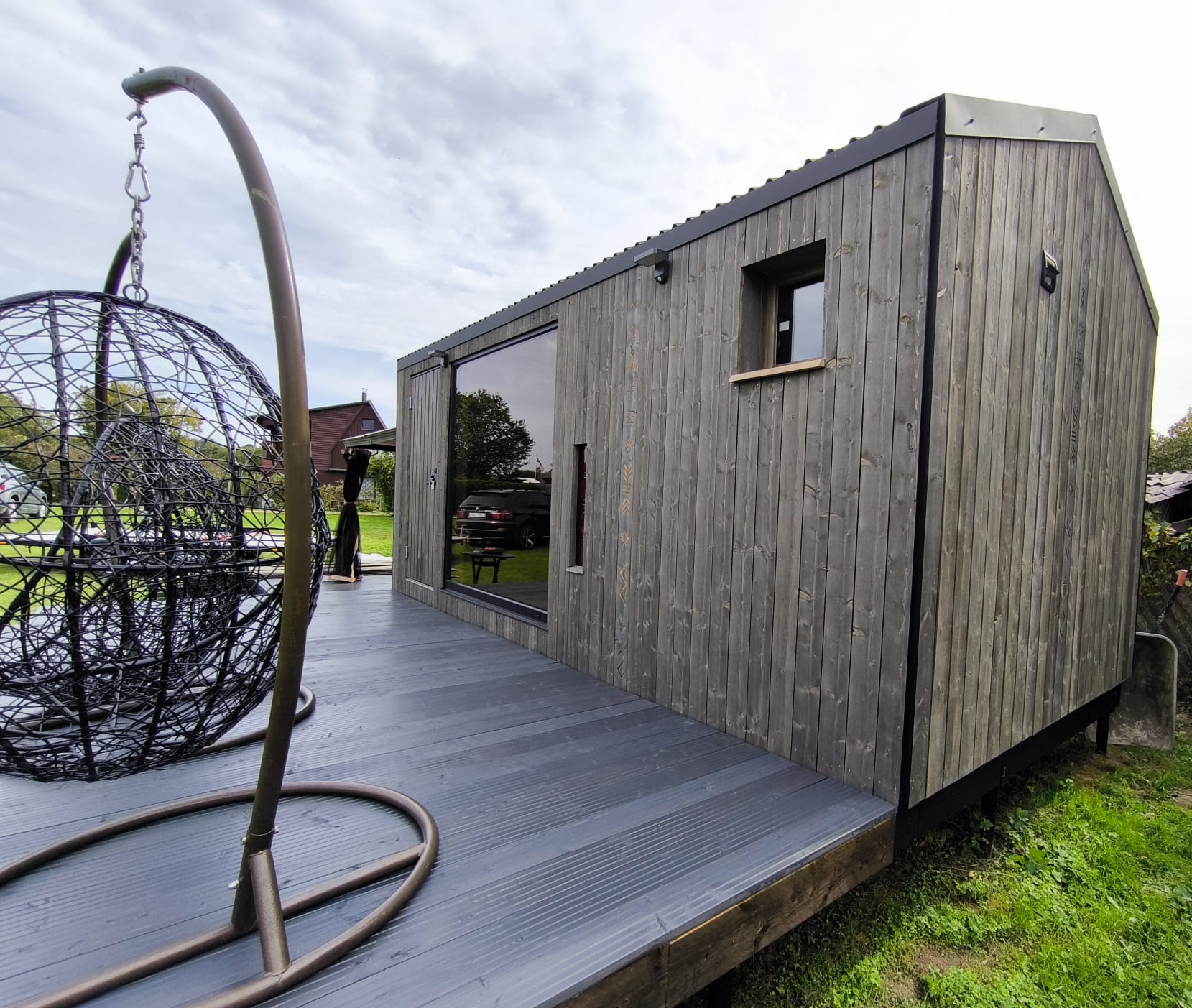 Small, ascetic sauna. Made from 45x95mm calibrated timber frame and 100mm mineralwool. High quality graphite finish, foil heat reflective insulation in the sauna room. The sauna floor covered with tiles, slope to the drain. Aspen wood in the sauna room – stained white. Plywood in living room, vinyl floor. LED design lights. Large mirror type tinted window (Possible to order mirror or matted windows). Metal profiled roof covering. Wifi controlled water heater with anti freeze function. Water pipes with heating cable. Great quality sauna heater. There will be a glass wall for the shower.