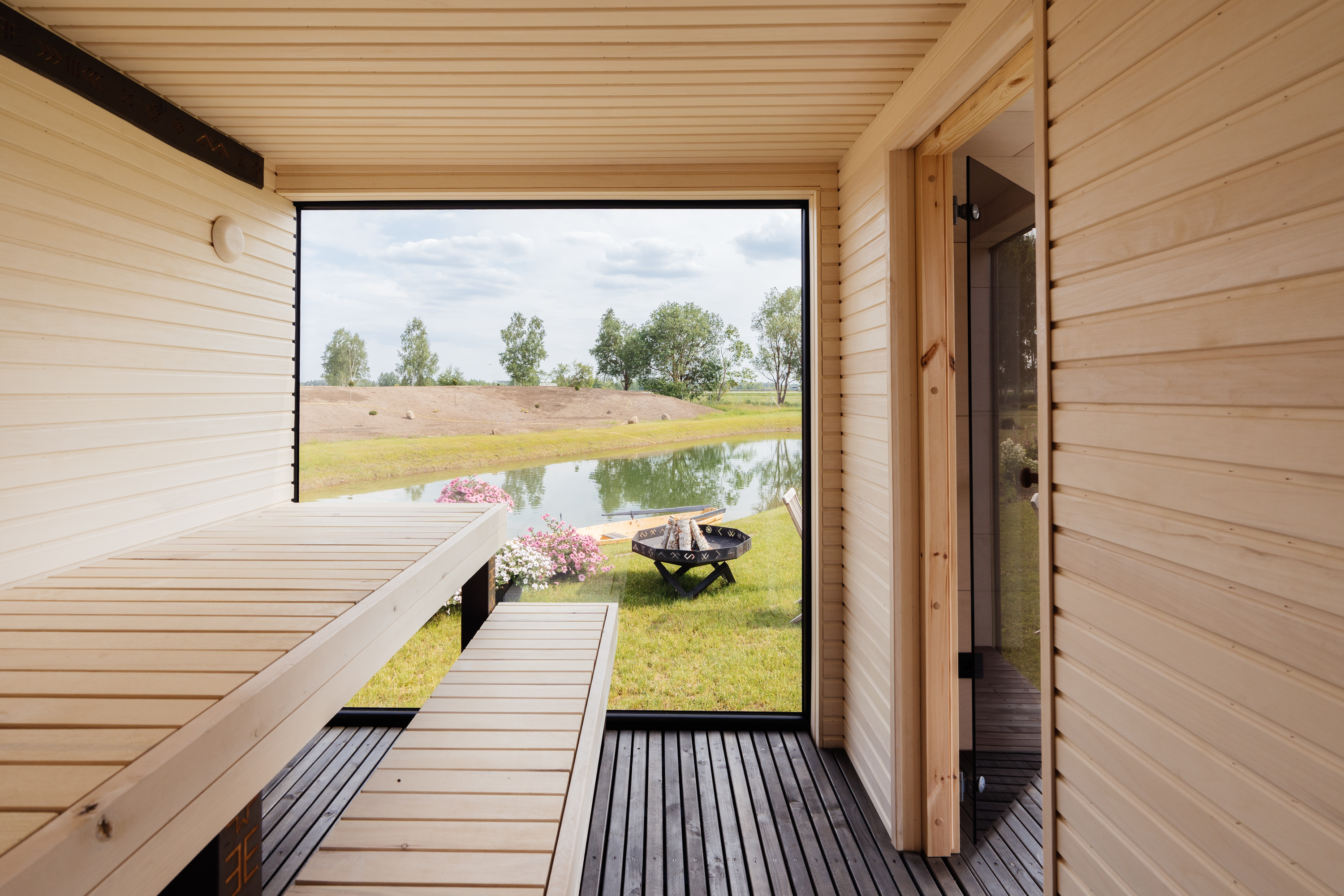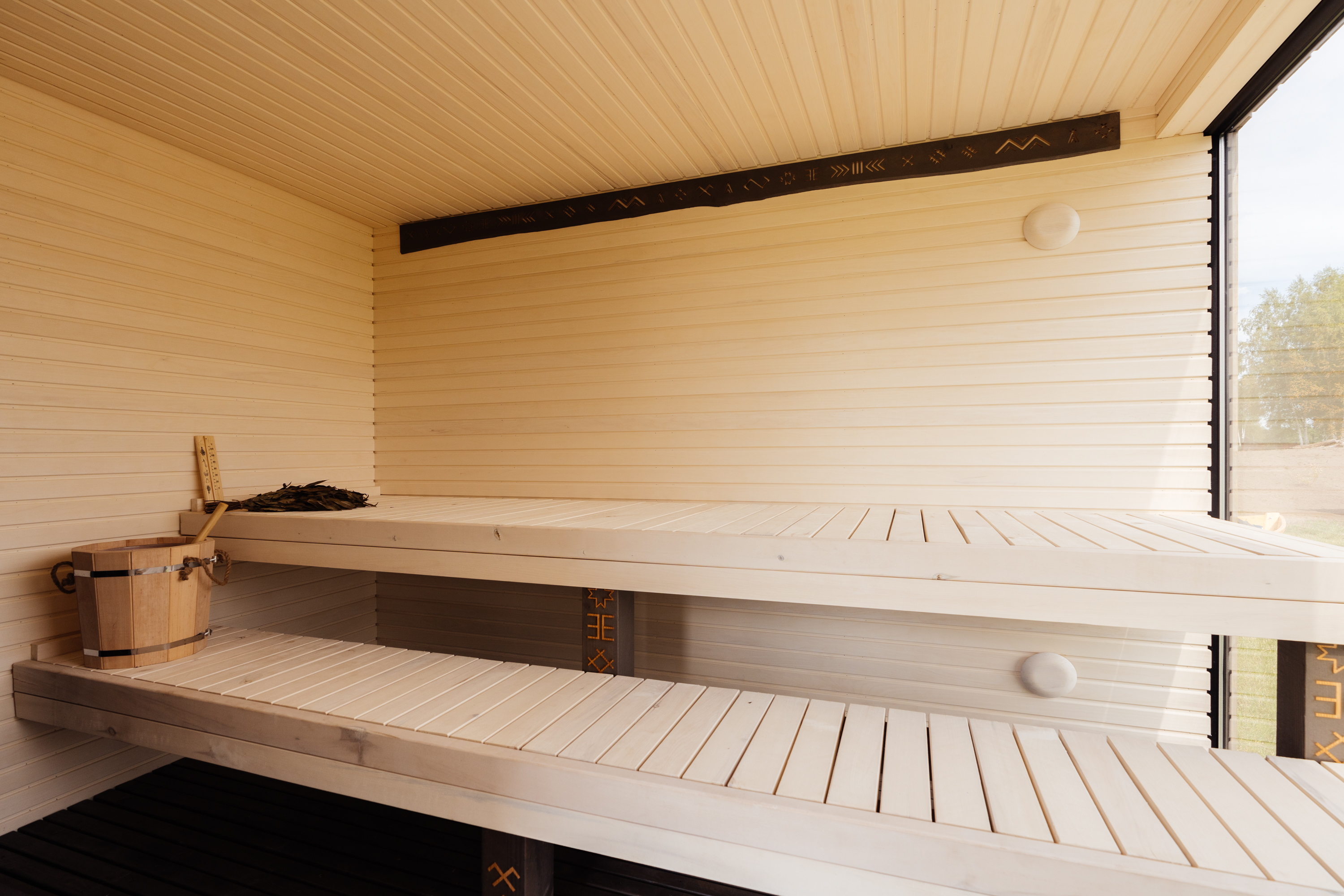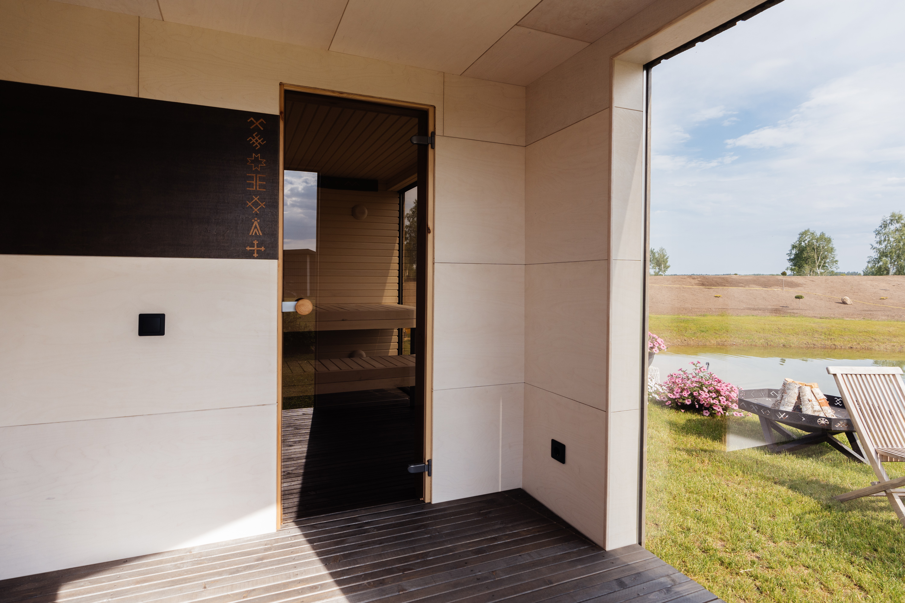 Small, ascetic sauna. Made from 50x100mm timber frame and 100mm mineralwool. High quality graphite finish, foil heat reflective insulation in the sauna room. Double hydro-insulation in the sauna floor, slope to the drain. Aspen wood in the sauna room – stained white. One level united floor without thresholds, made from 45x45mm calibrated timber. LED lights in black alder boards. Large mirror type tinted windows (Possible to order mirror or matted windows). Metal profiled roof covering, anthracite colour.