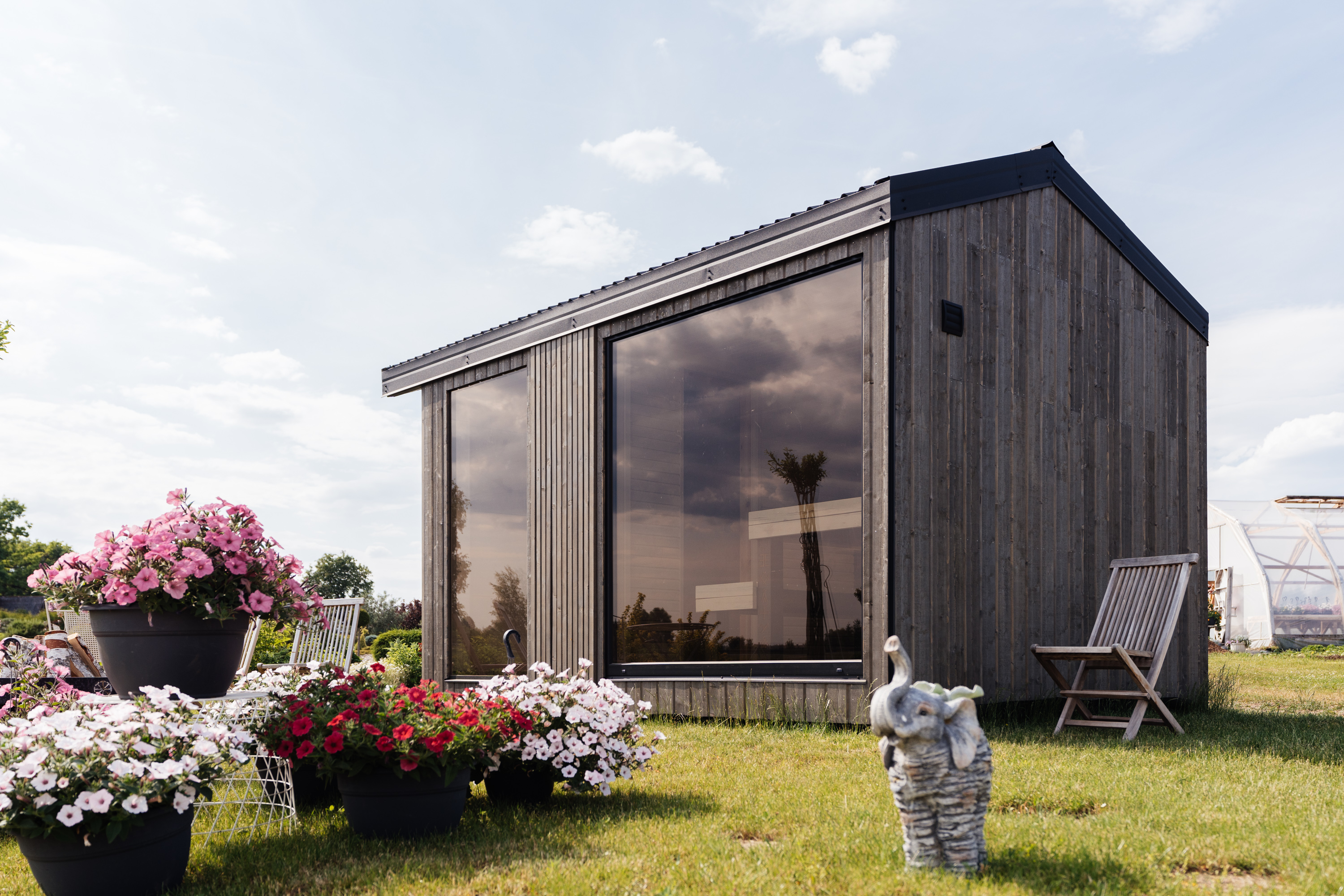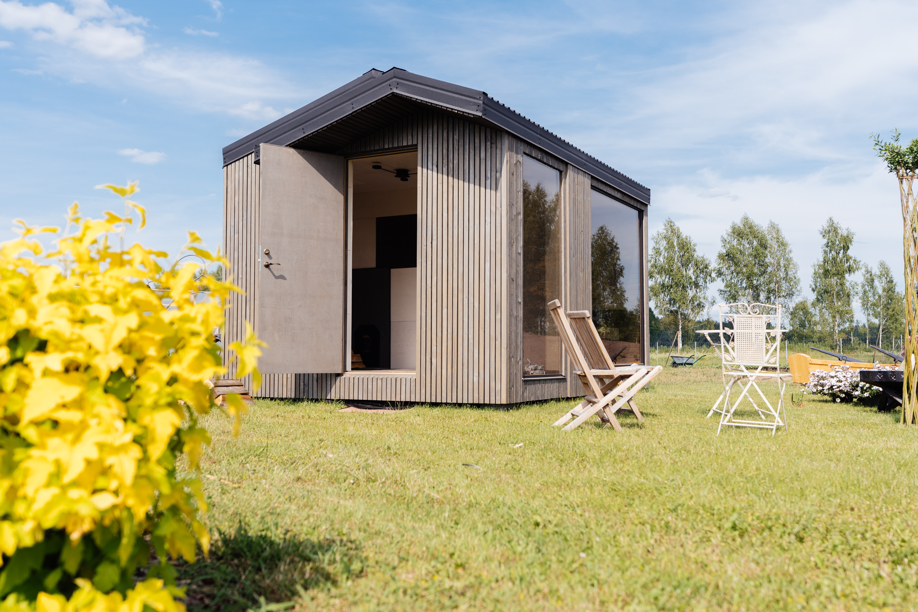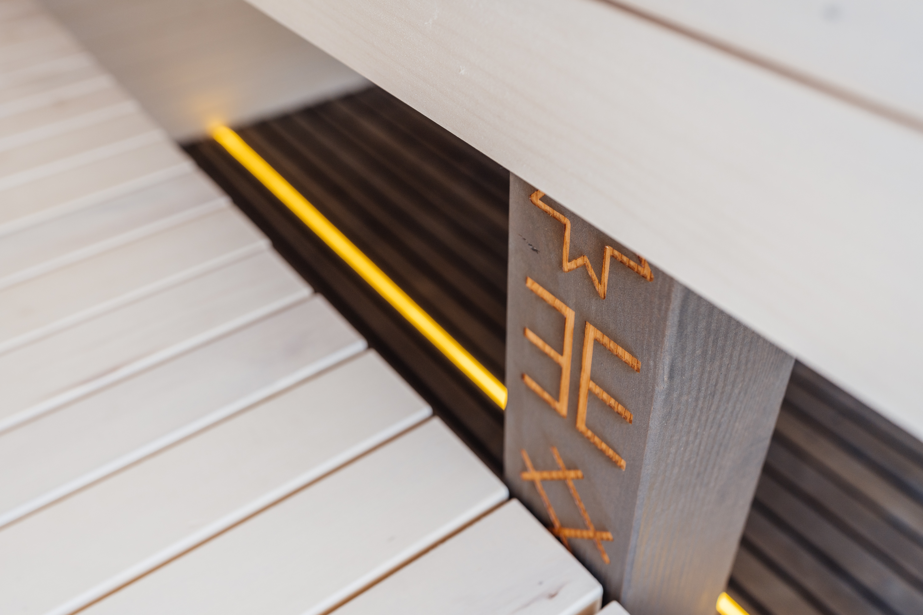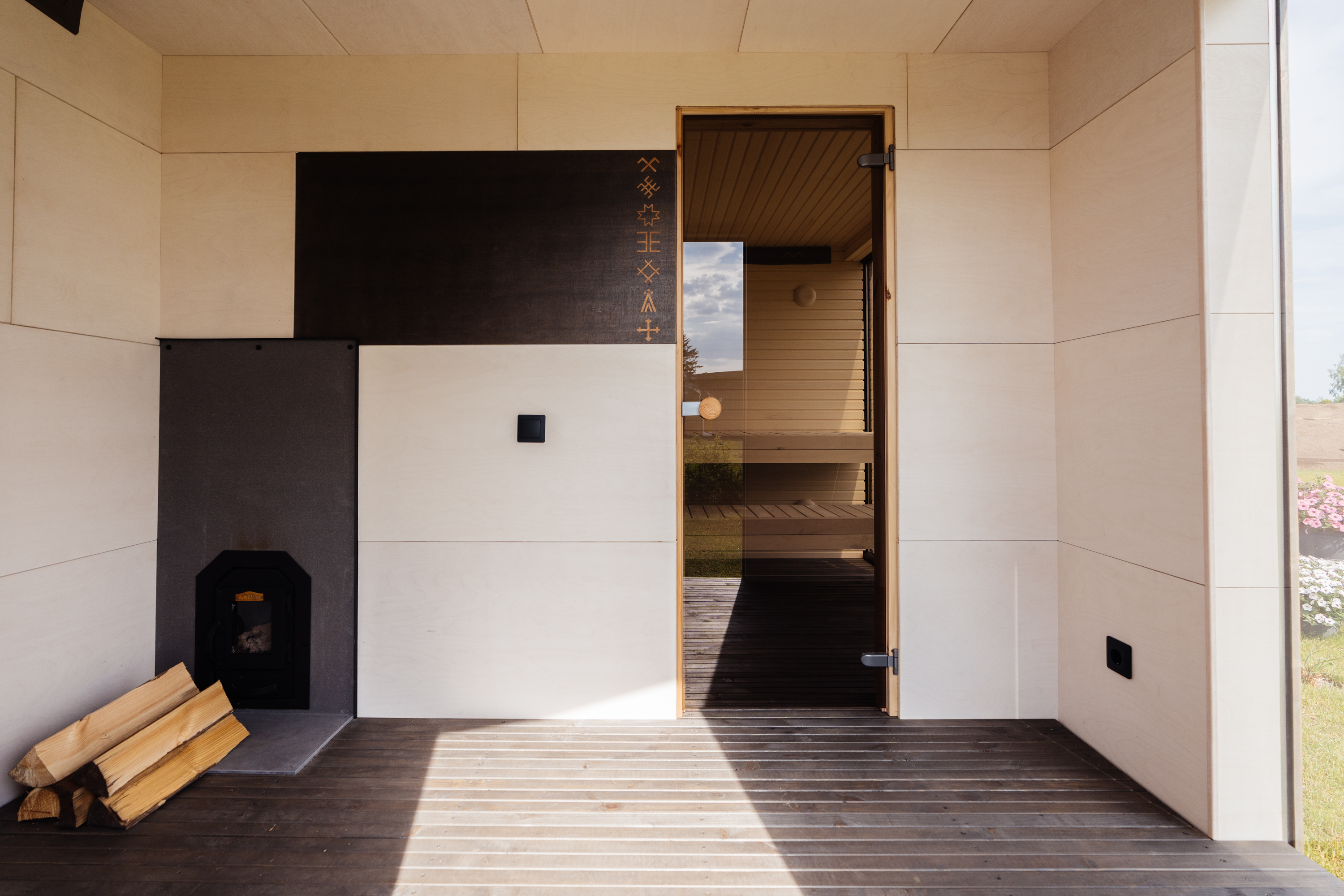 Small, ascetic sauna. Made from 50x100mm timber frame and 100mm mineralwool. High quality graphite finish, foil heat reflective insulation in the sauna room. Double hydro-insulation in the sauna floor, slope to the drain. Aspen wood in the sauna room – stained white. One level united floor without thresholds, made from 45x45mm calibrated timber. LED lights in black alder boards. Large mirror type tinted windows (Possible to order mirror or matted windows). Metal profiled roof covering, anthracite colour.
