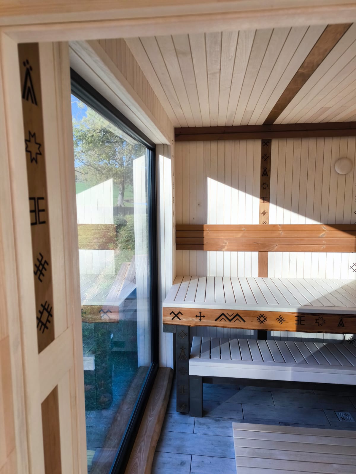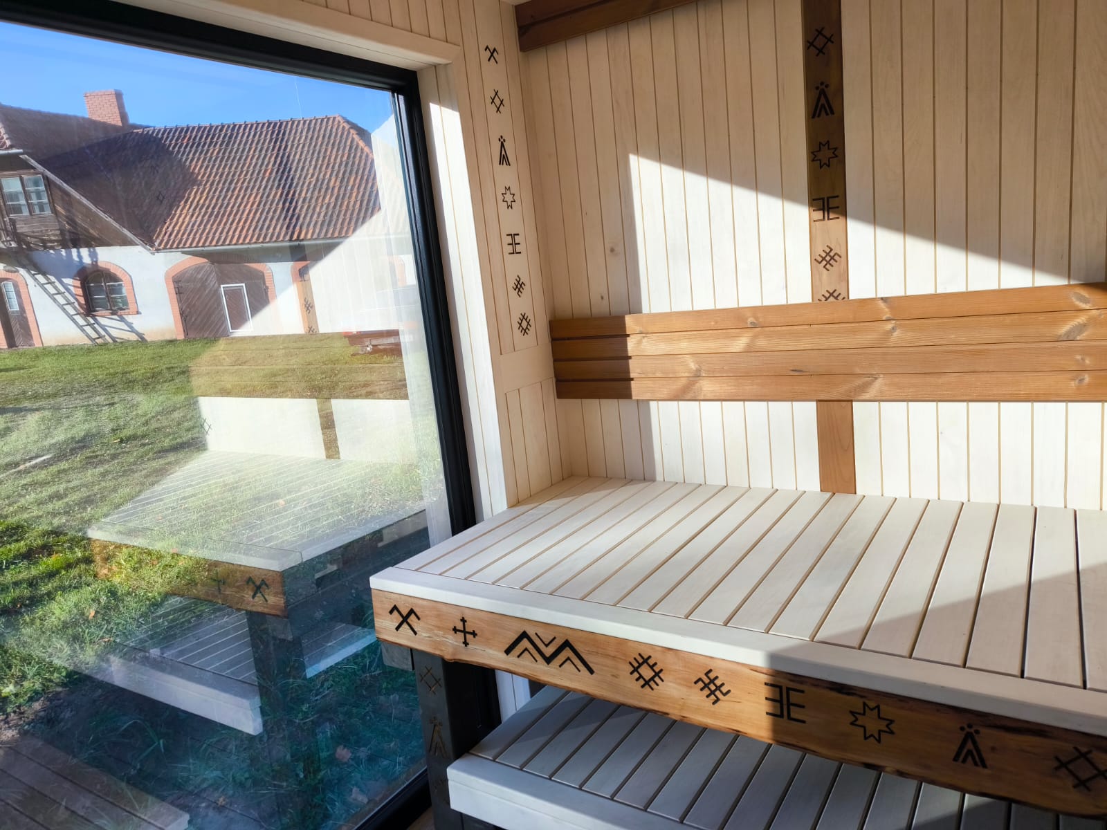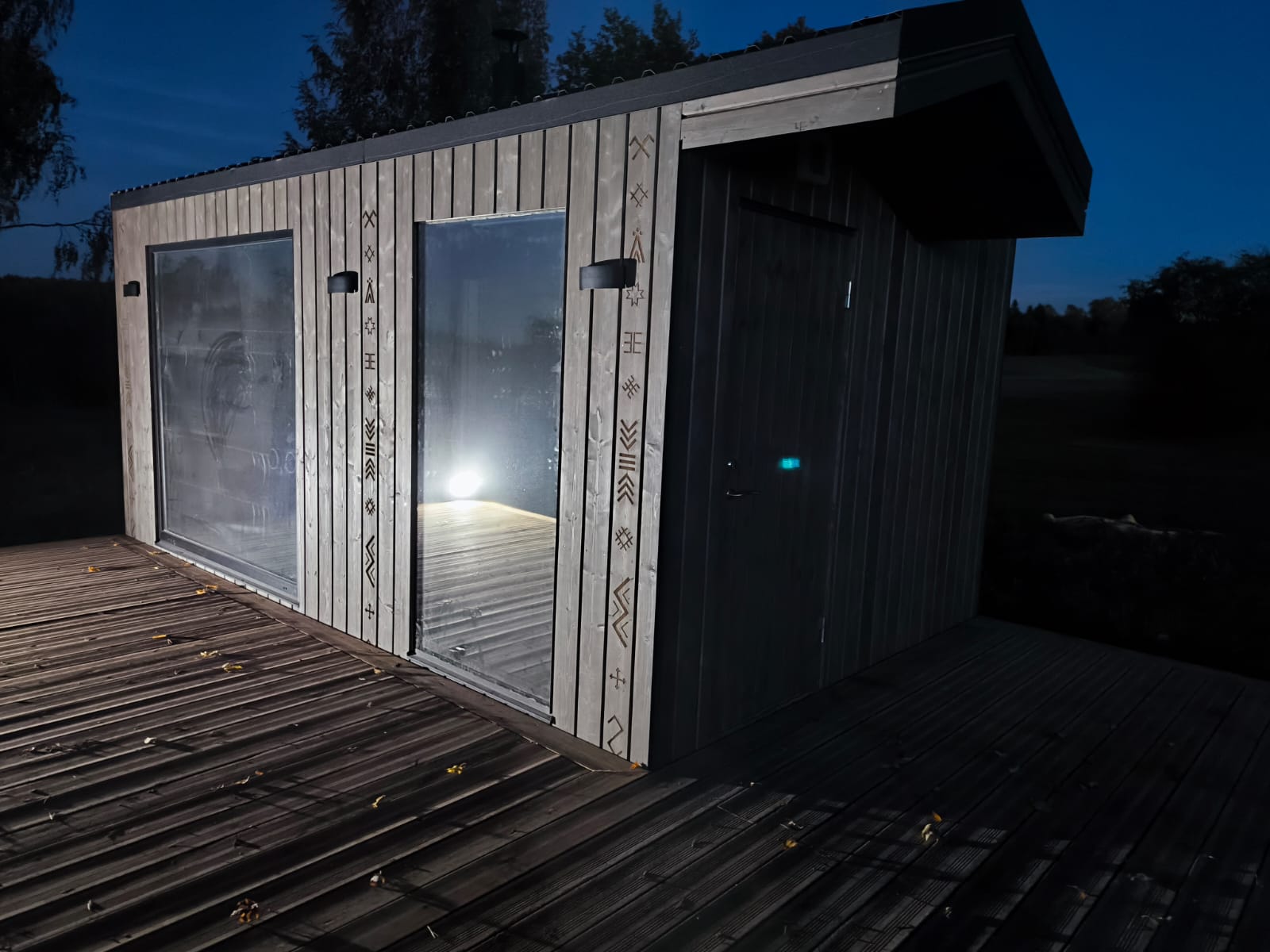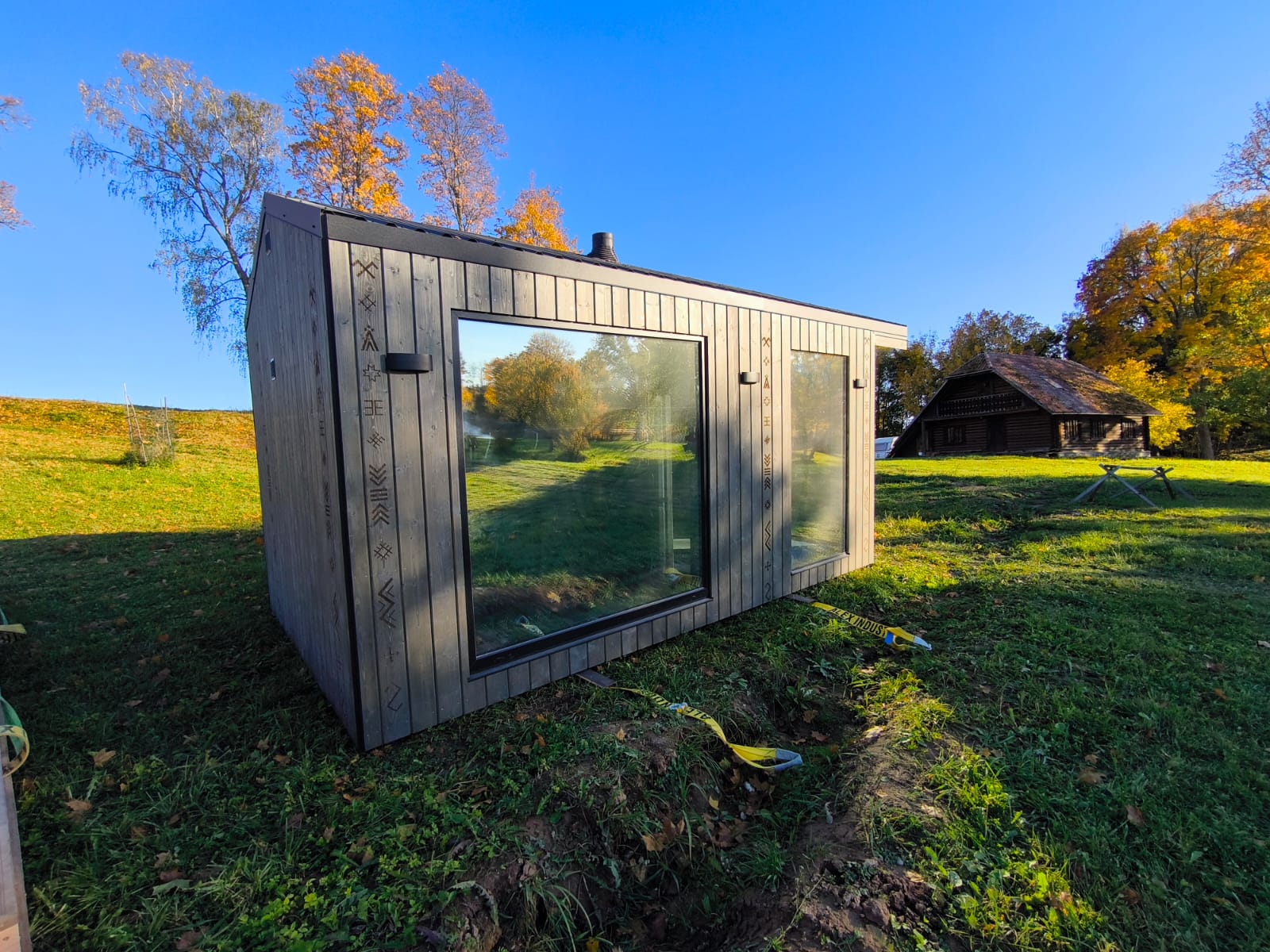 Small, ascetic sauna. Made from 45x95mm calibrated timber frame and 100mm mineralwool. High quality graphite finish, foil heat reflective insulation in the sauna room. The sauna floor covered with tiles, slope to the drain. Linden wood in the sauna room – stained white. Plywood in living room, laminate floor. LED design lights. Large mirror type tinted windows (Possible to order mirror or matted windows). Metal roof covering. Wifi controlled water heater with antifreeze function. Waterpipes installed with heating wire. Firewood sauna heater. Proper sauna ventilation system.