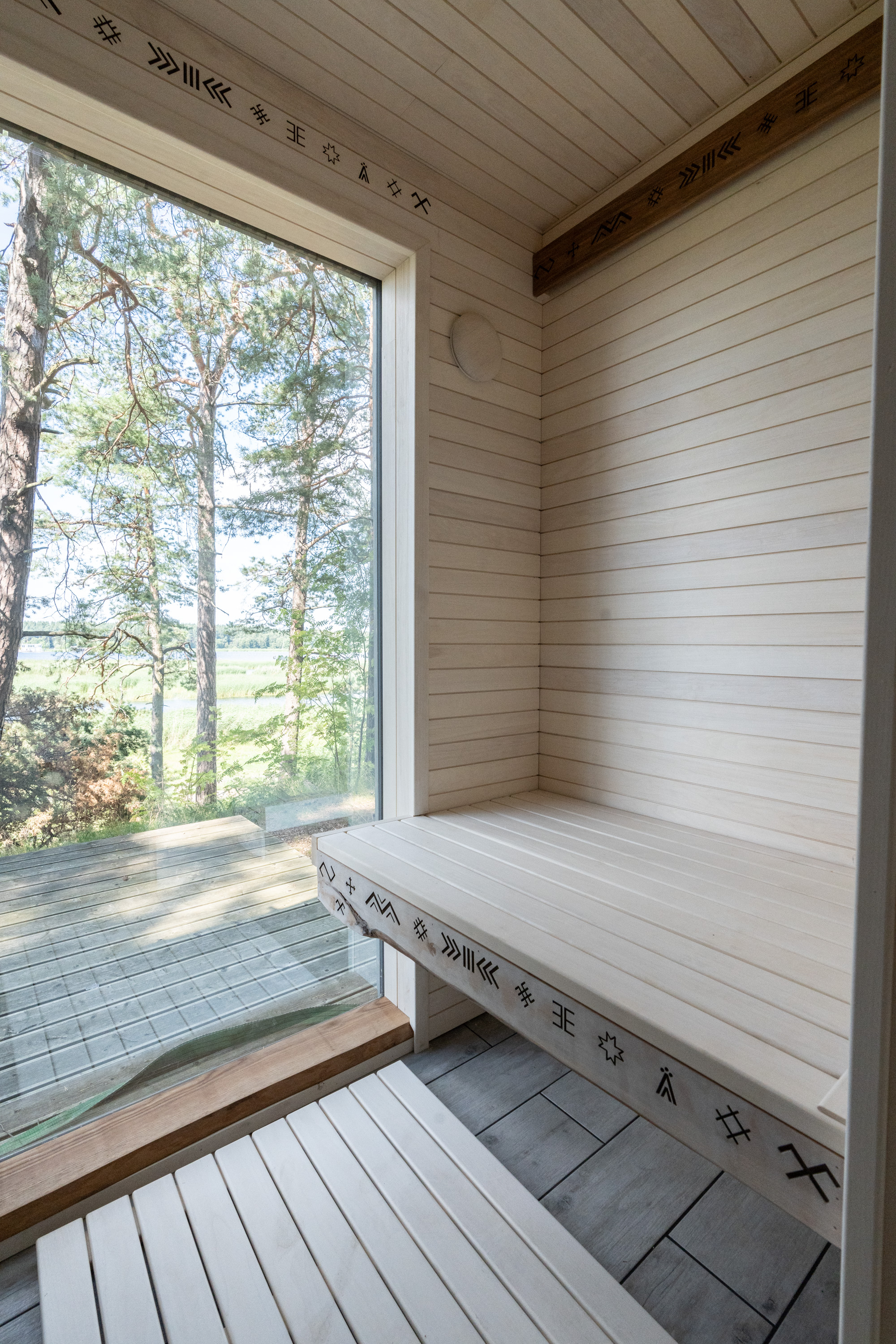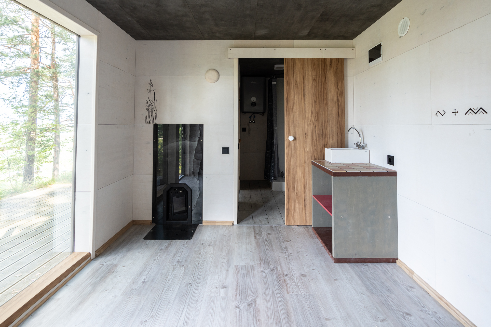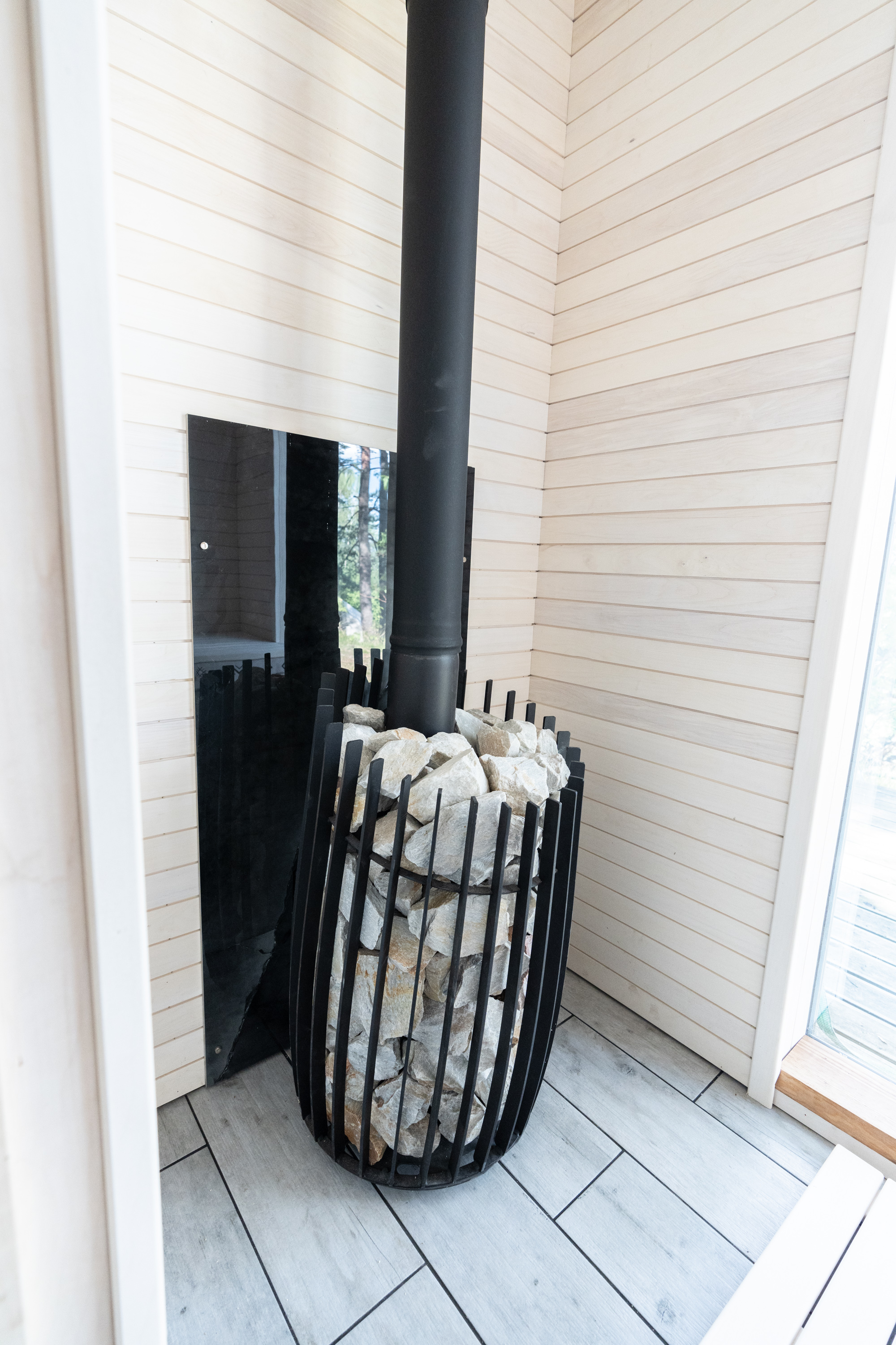 Small, ascetic sauna. Made from 45x95mm calibrated timber frame and 100mm mineralwool. High quality graphite finish, foil heat reflective insulation in the sauna room. The sauna floor covered with tiles, slope to the drain. Aspen wood in the sauna room – stained white. Plywood in living room, laminate floor. LED design lights. Large mirror type tinted windows (Possible to order mirror or matted windows). Metal profiled roof covering. Wifi controlled water heater with anti freeze function. Water pipes with heating cable. Great quality sauna heater.