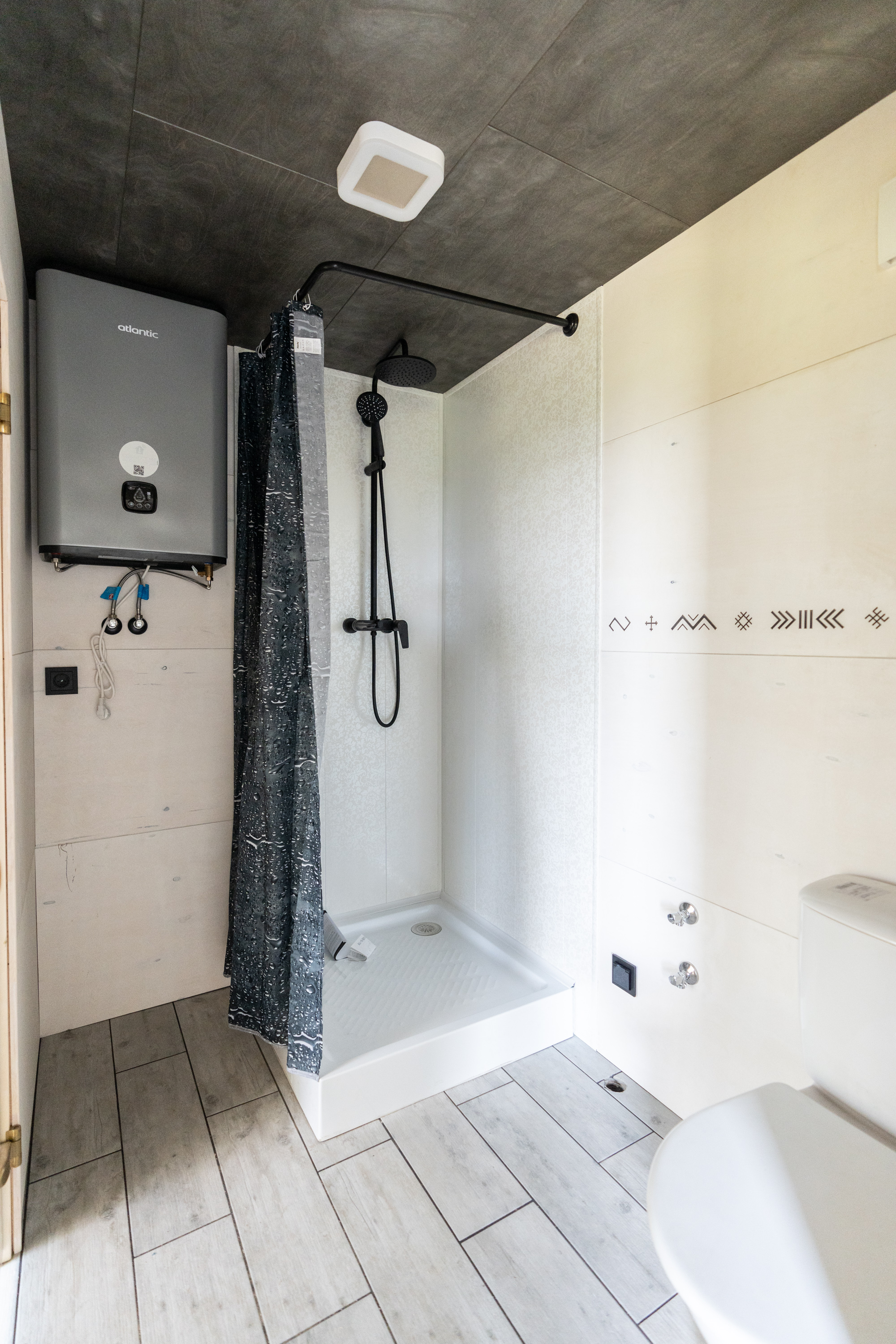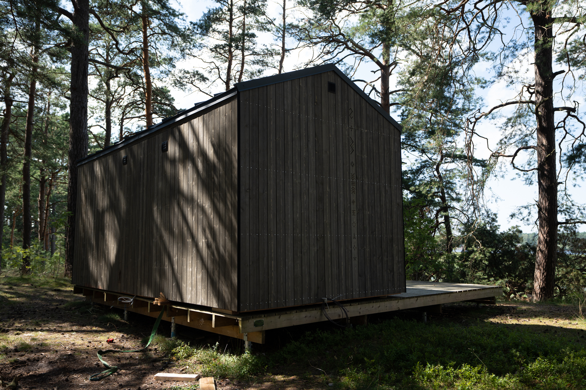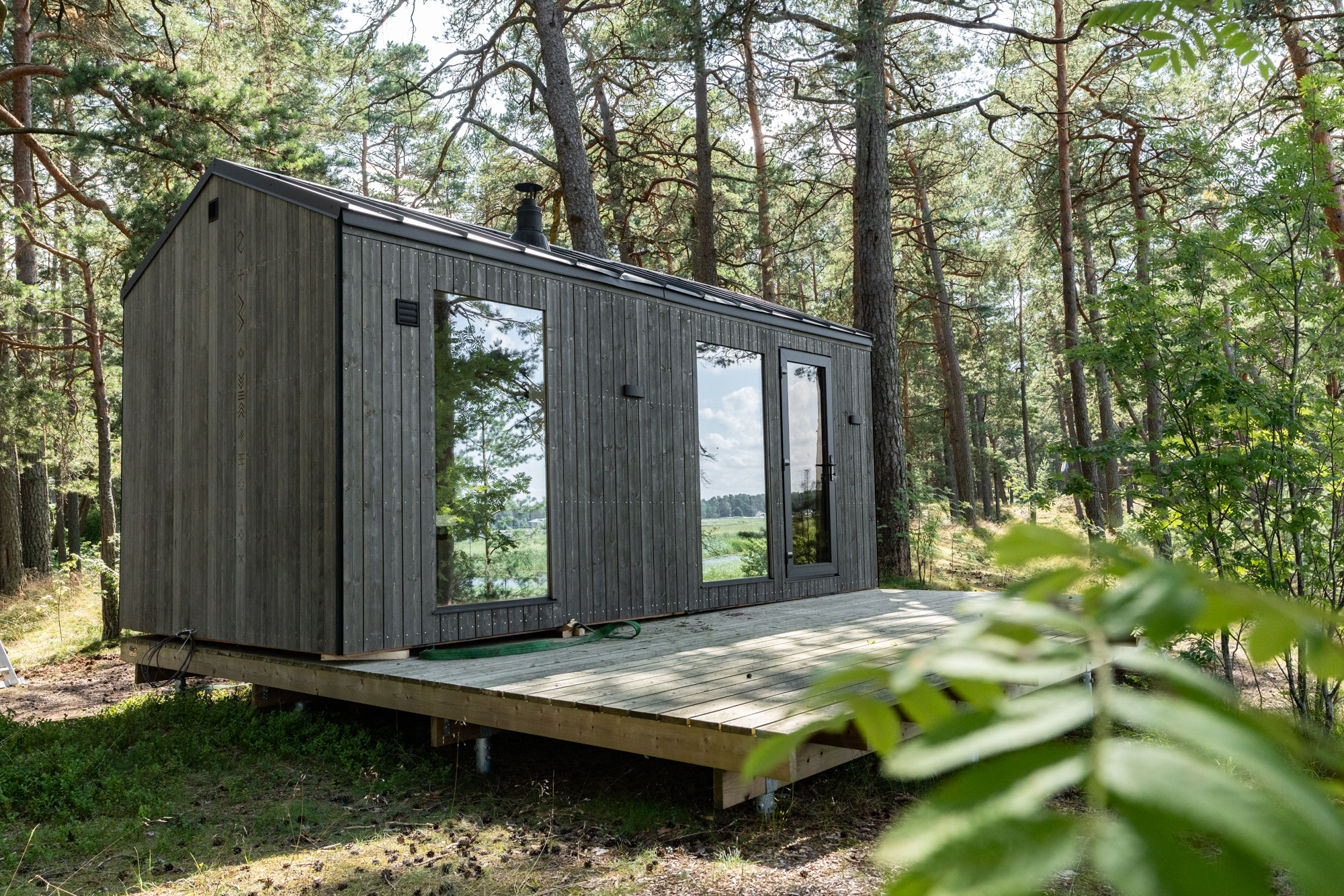 Small, ascetic sauna. Made from 45x95mm calibrated timber frame and 100mm mineralwool. High quality graphite finish, foil heat reflective insulation in the sauna room. The sauna floor covered with tiles, slope to the drain. Aspen wood in the sauna room – stained white. Plywood in living room, laminate floor. LED design lights. Large mirror type tinted windows (Possible to order mirror or matted windows). Metal profiled roof covering. Wifi controlled water heater with anti freeze function. Water pipes with heating cable. Great quality sauna heater.